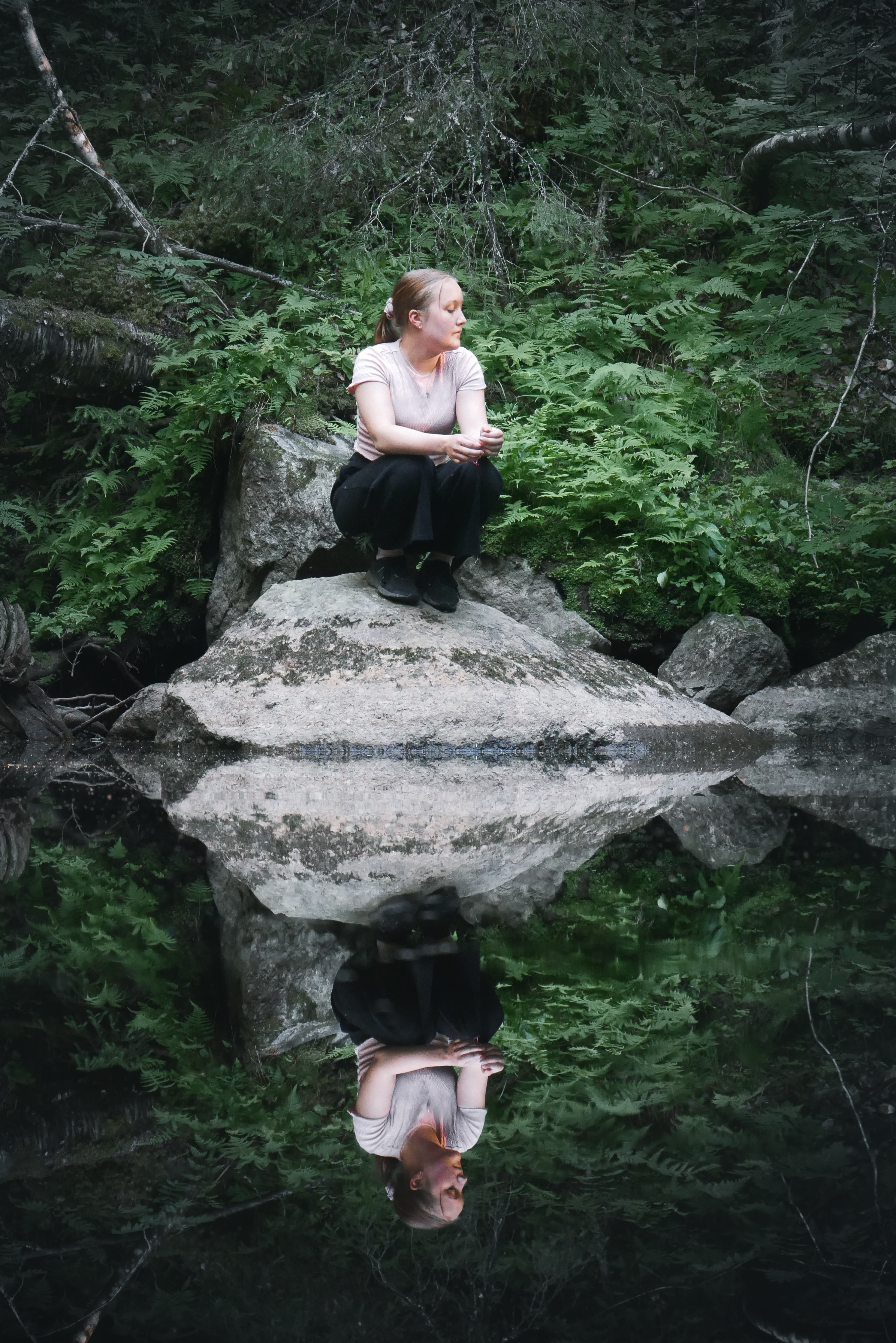 - Woman on rock by water with reflection, natural photography
