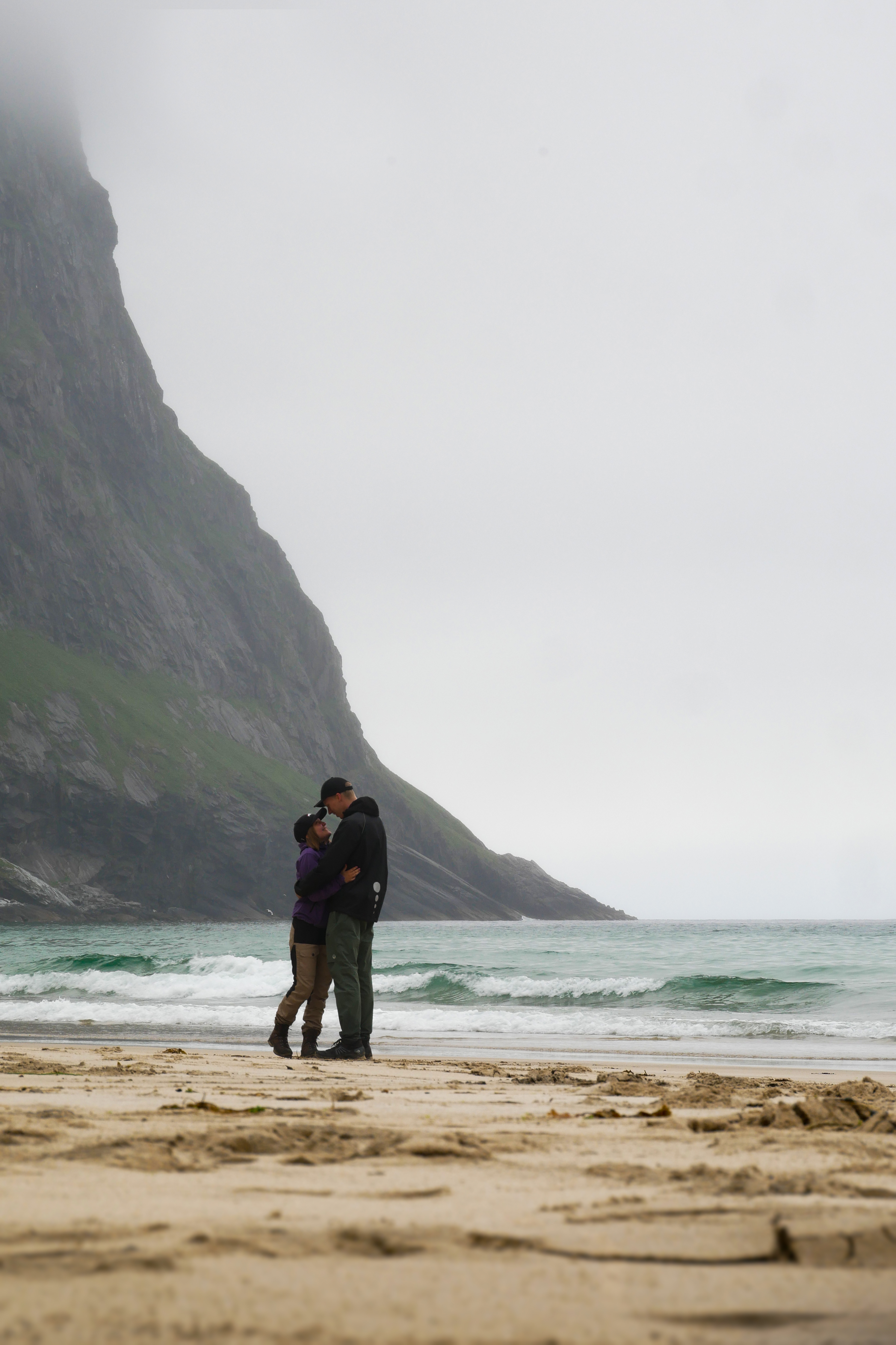 - Couple embracing on a beach with a mountain
