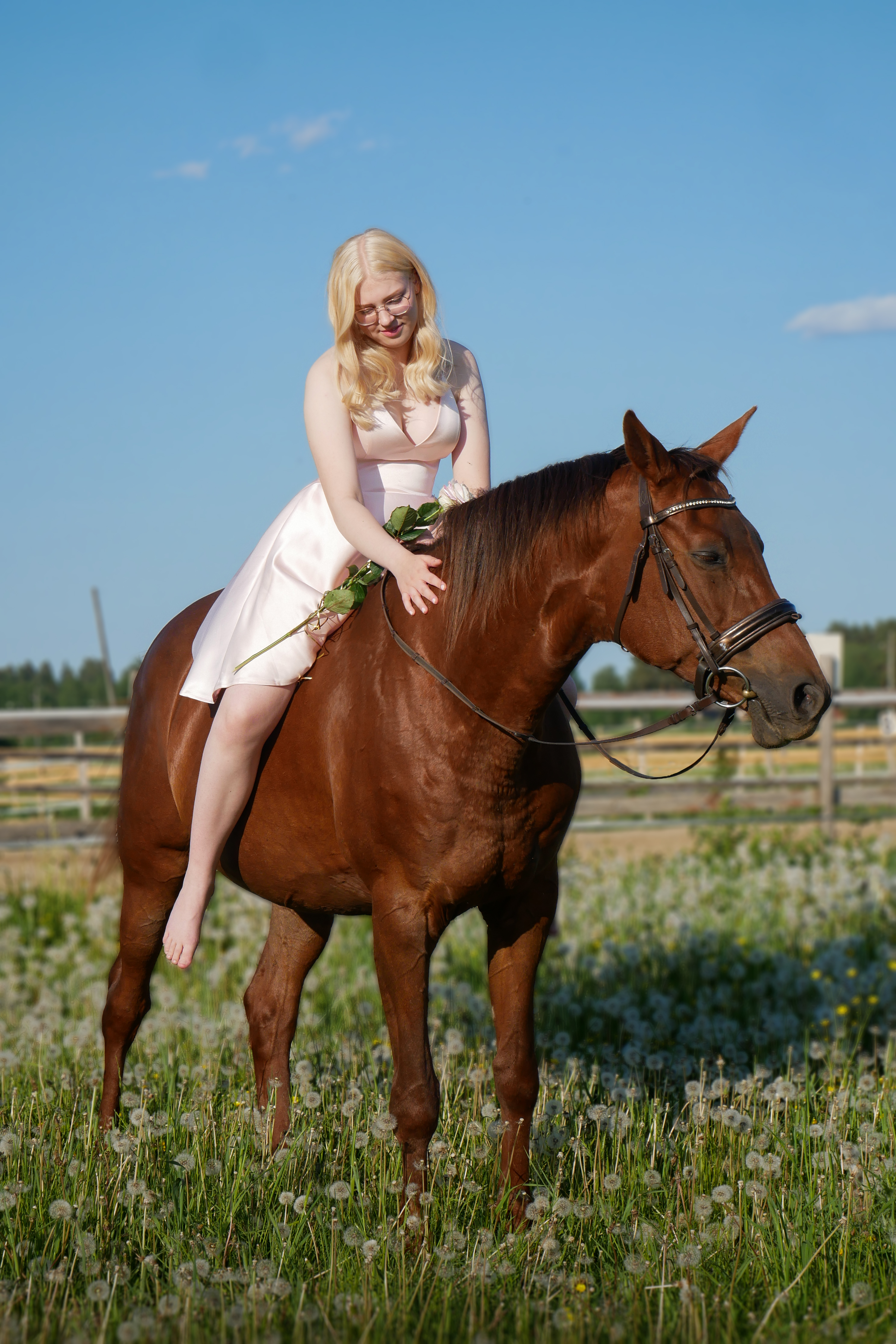 - Blonde woman in dress riding a brown horse