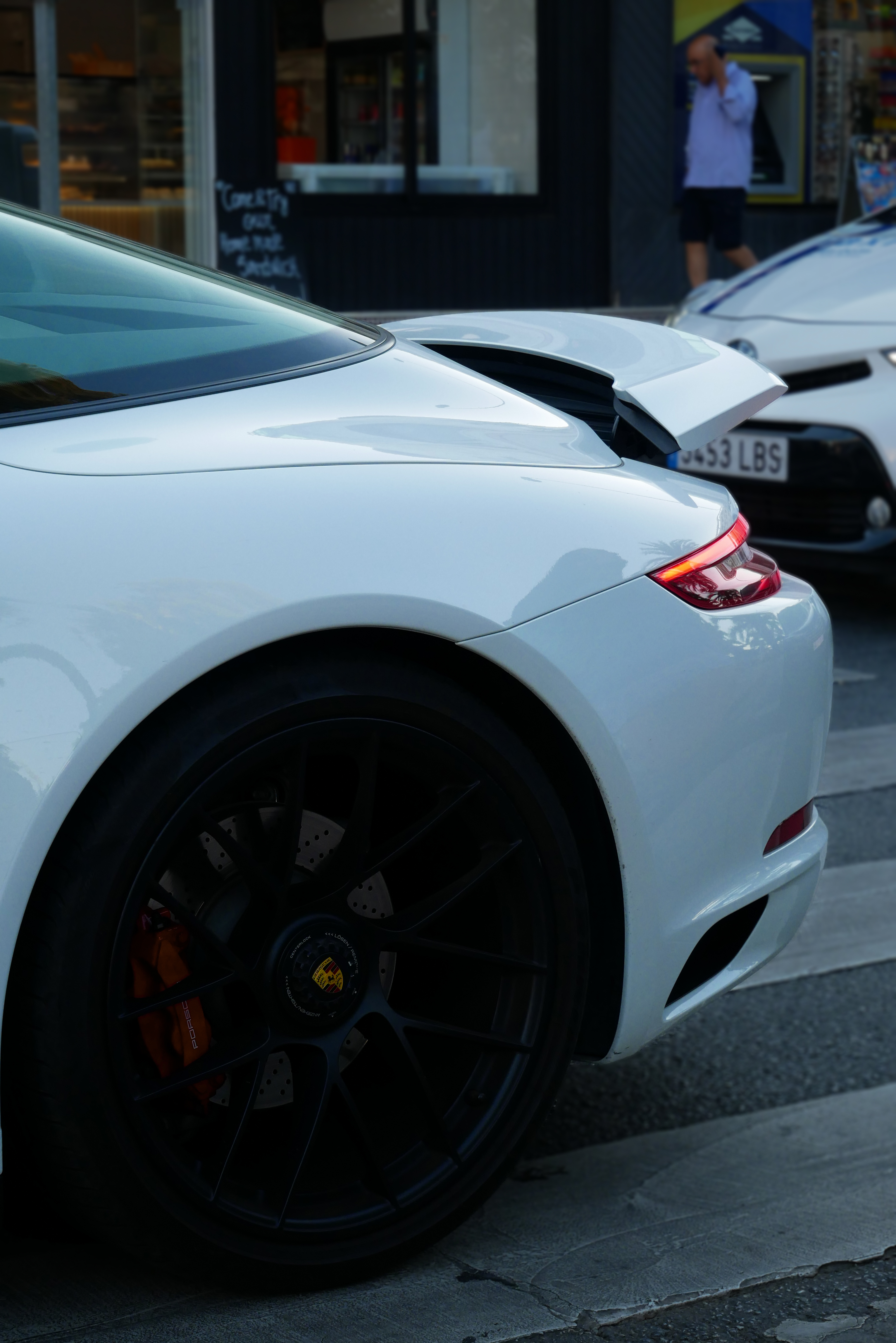 - Rear of a white sports car with black wheels