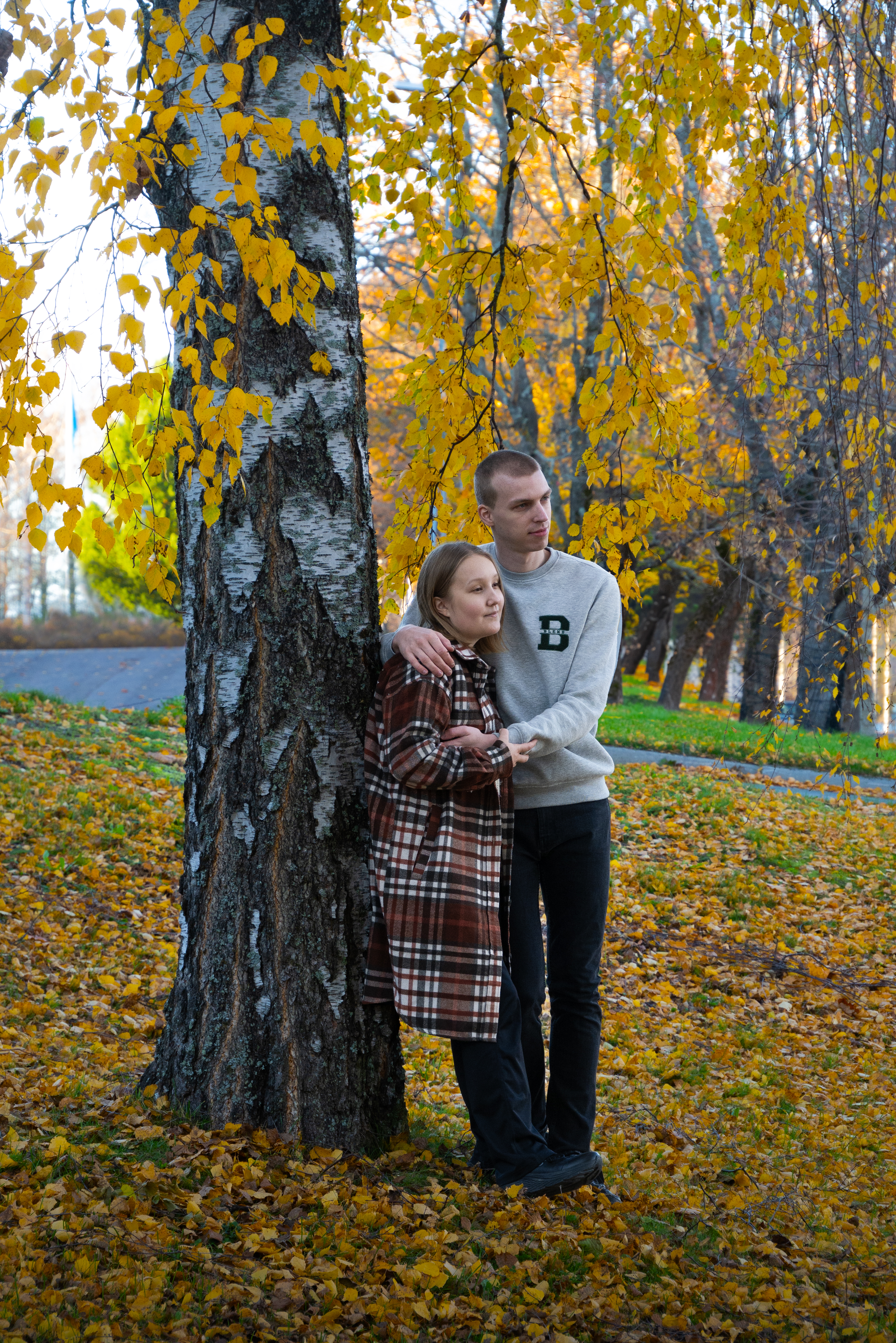 - Couple embracing by a birch tree in an autumn park