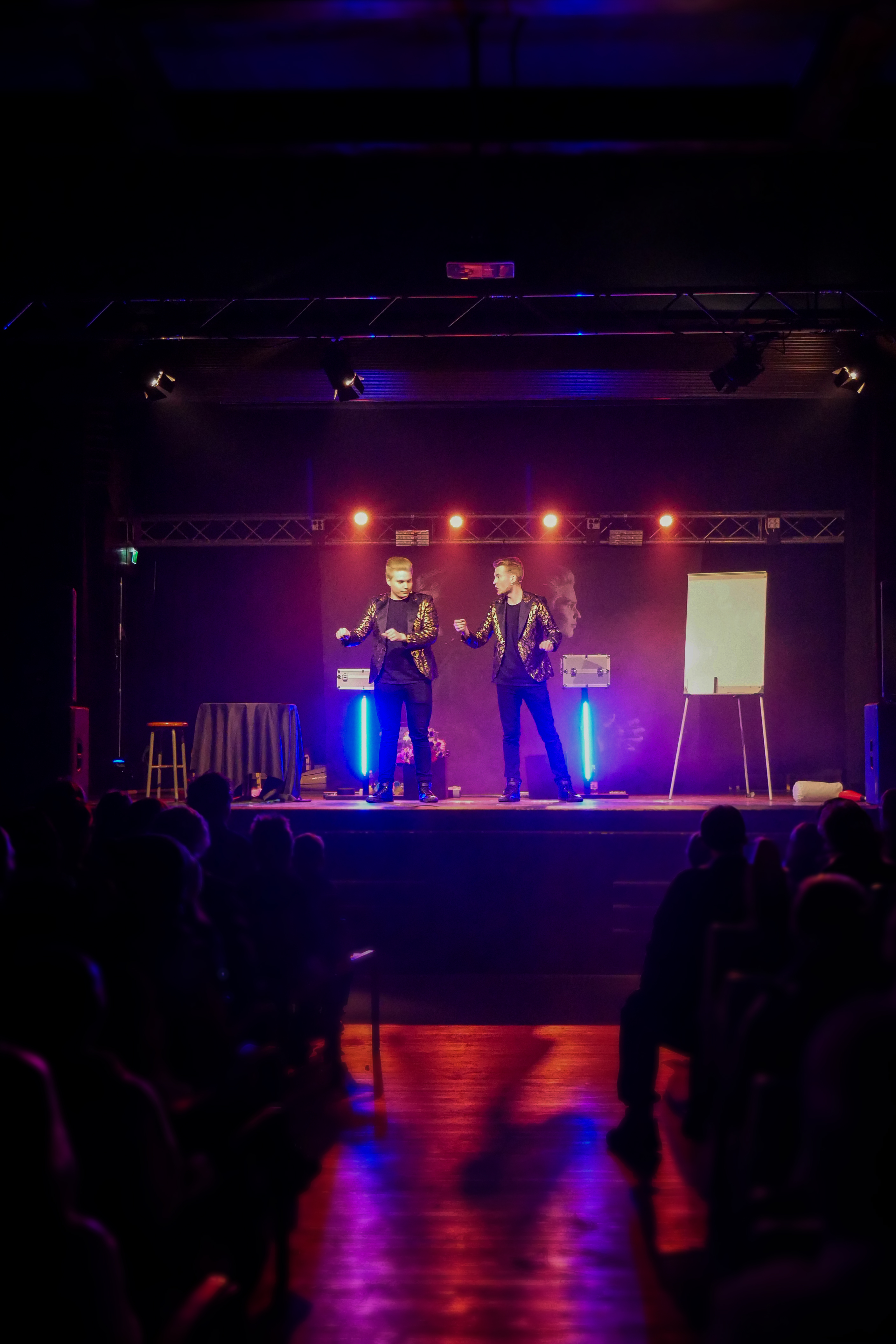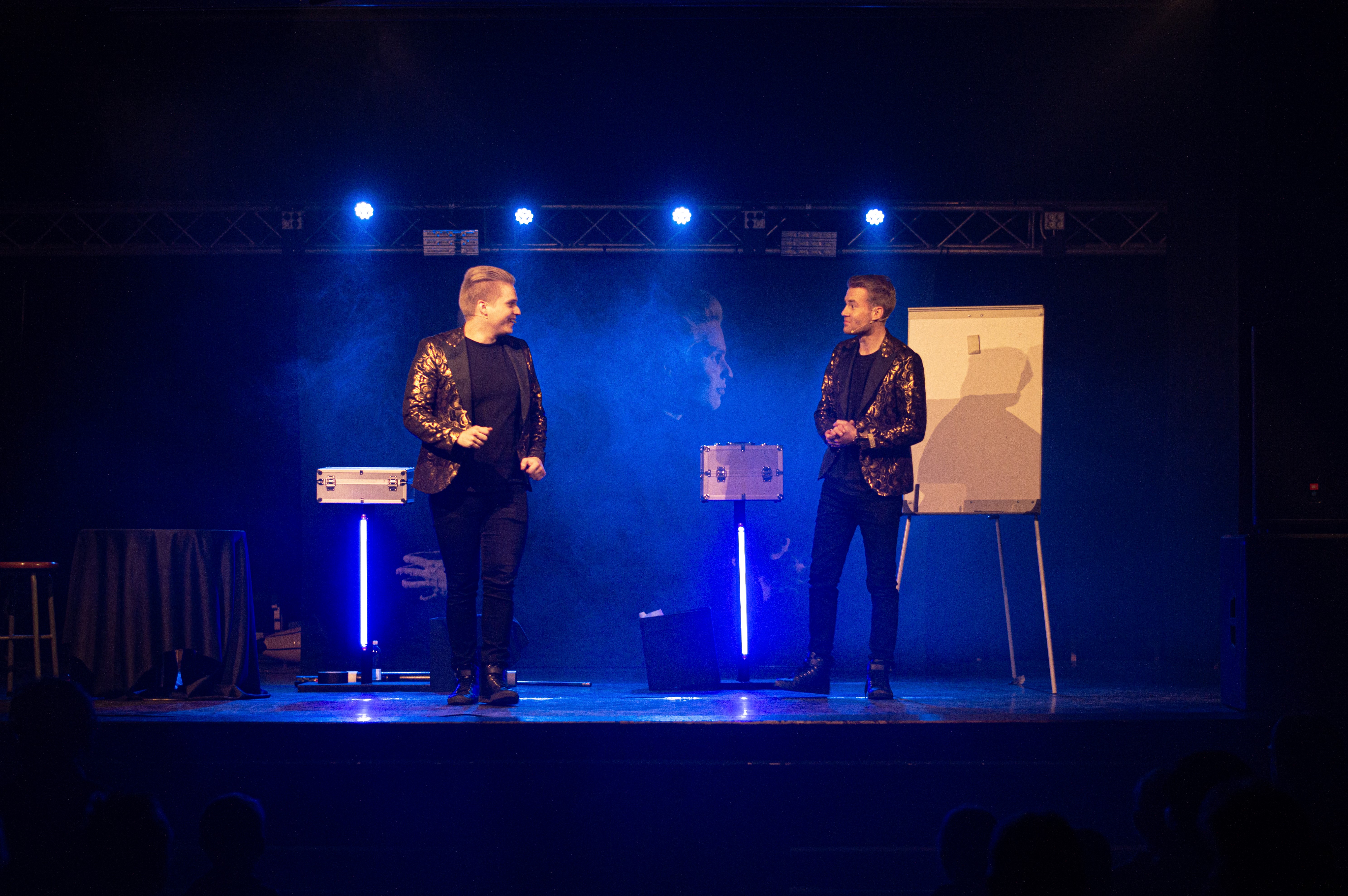 - Two performers on stage with an audience