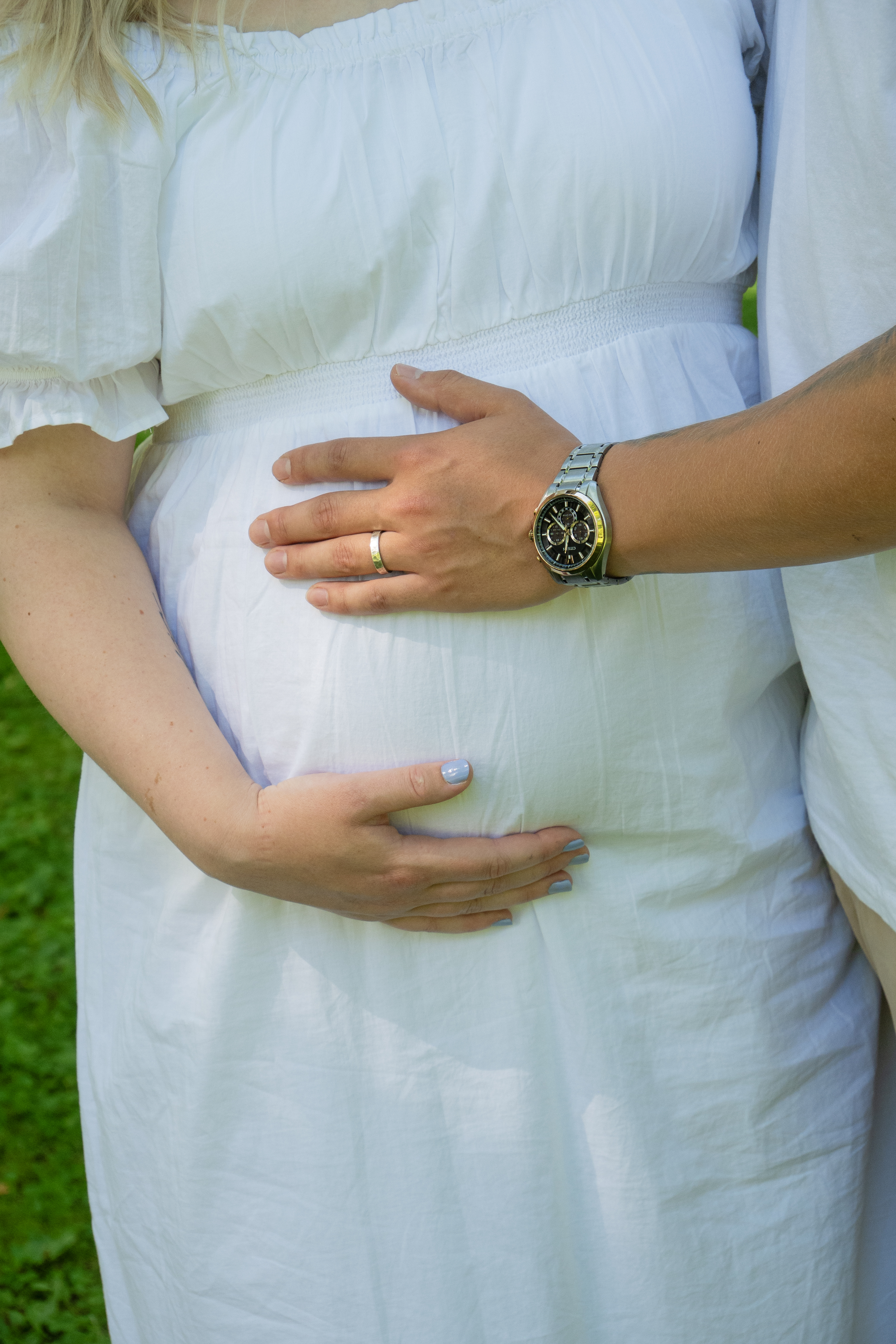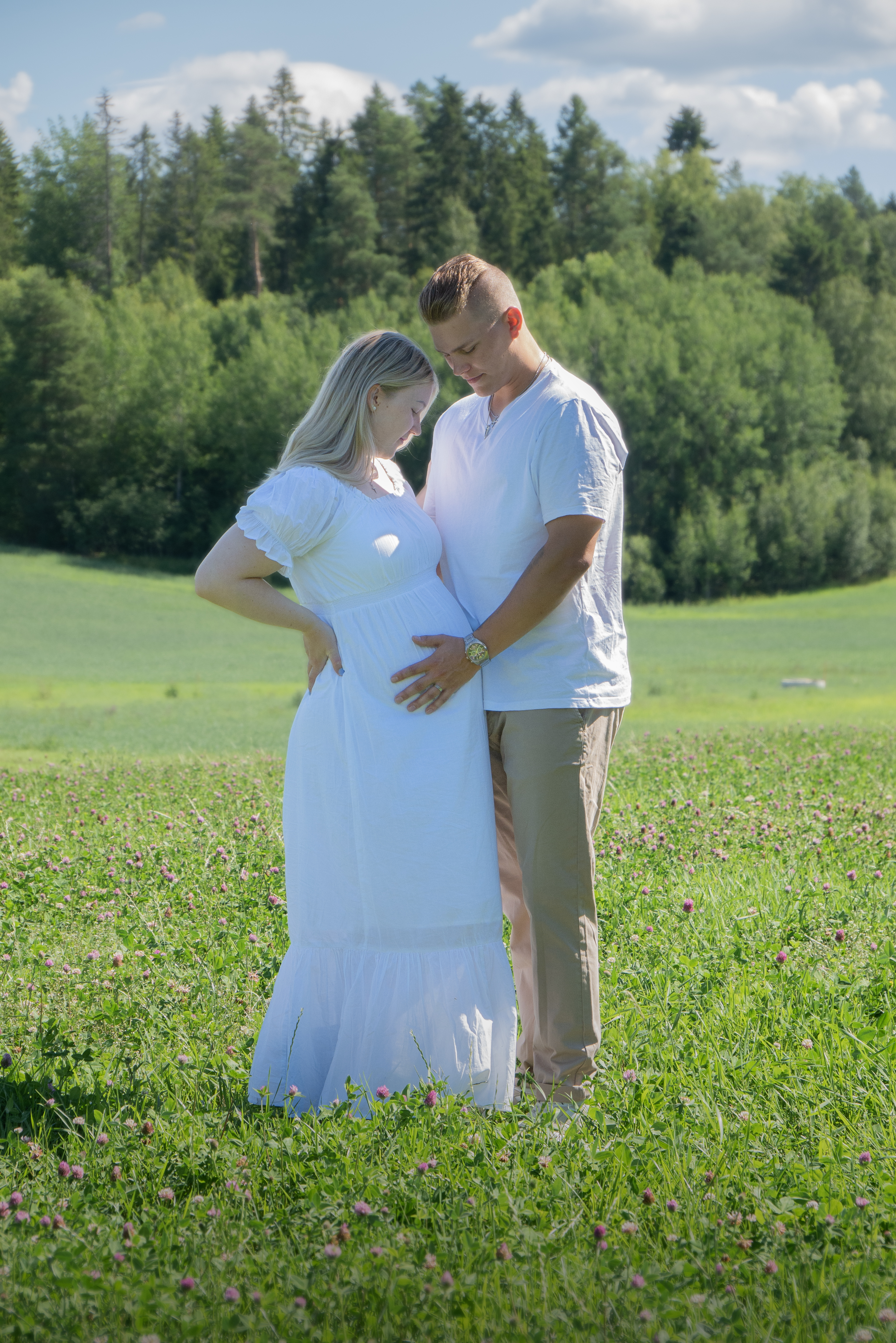 - Maternity photography of a couple embracing in a field