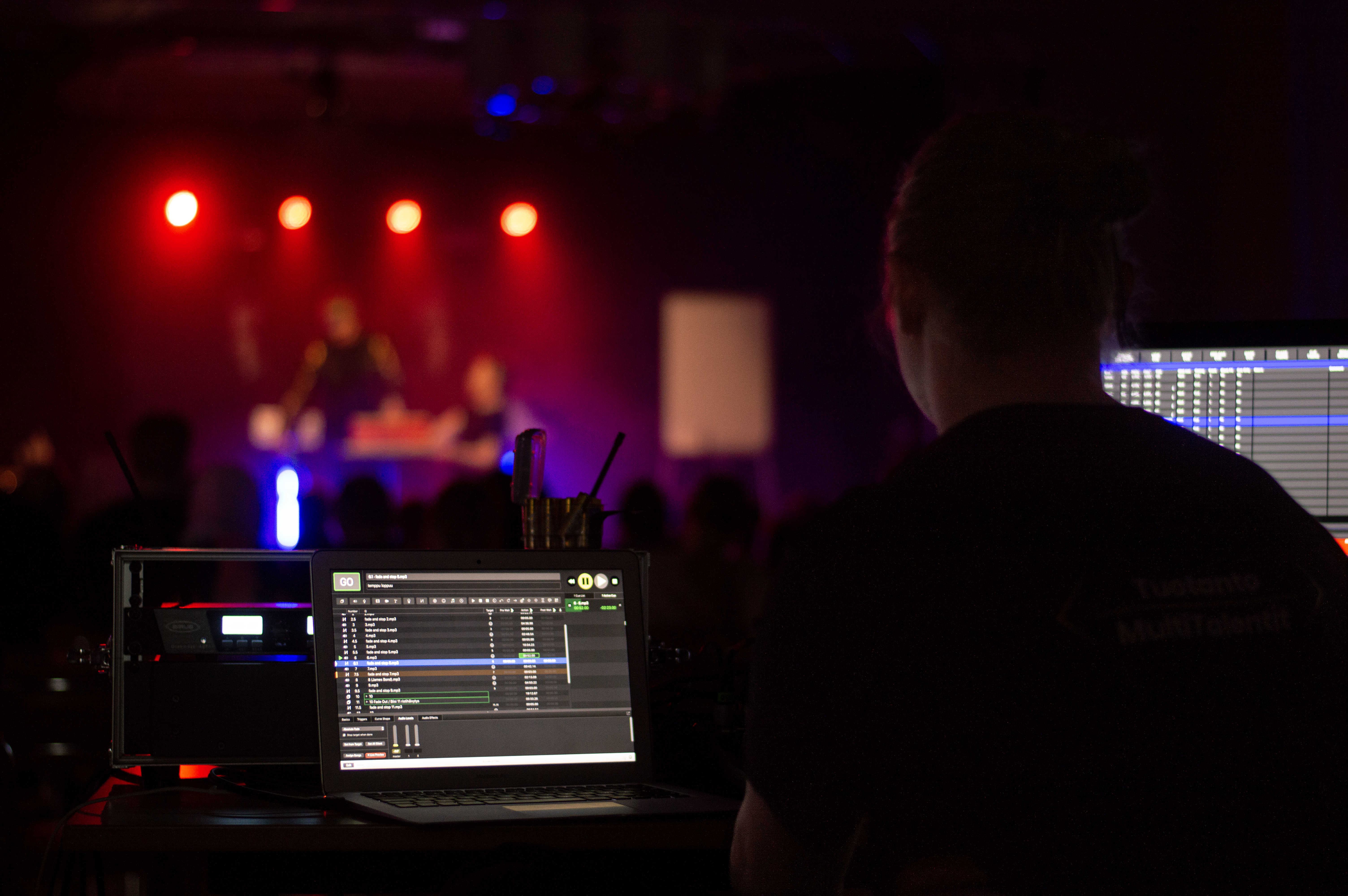 - Sound engineer at laptop during a concert