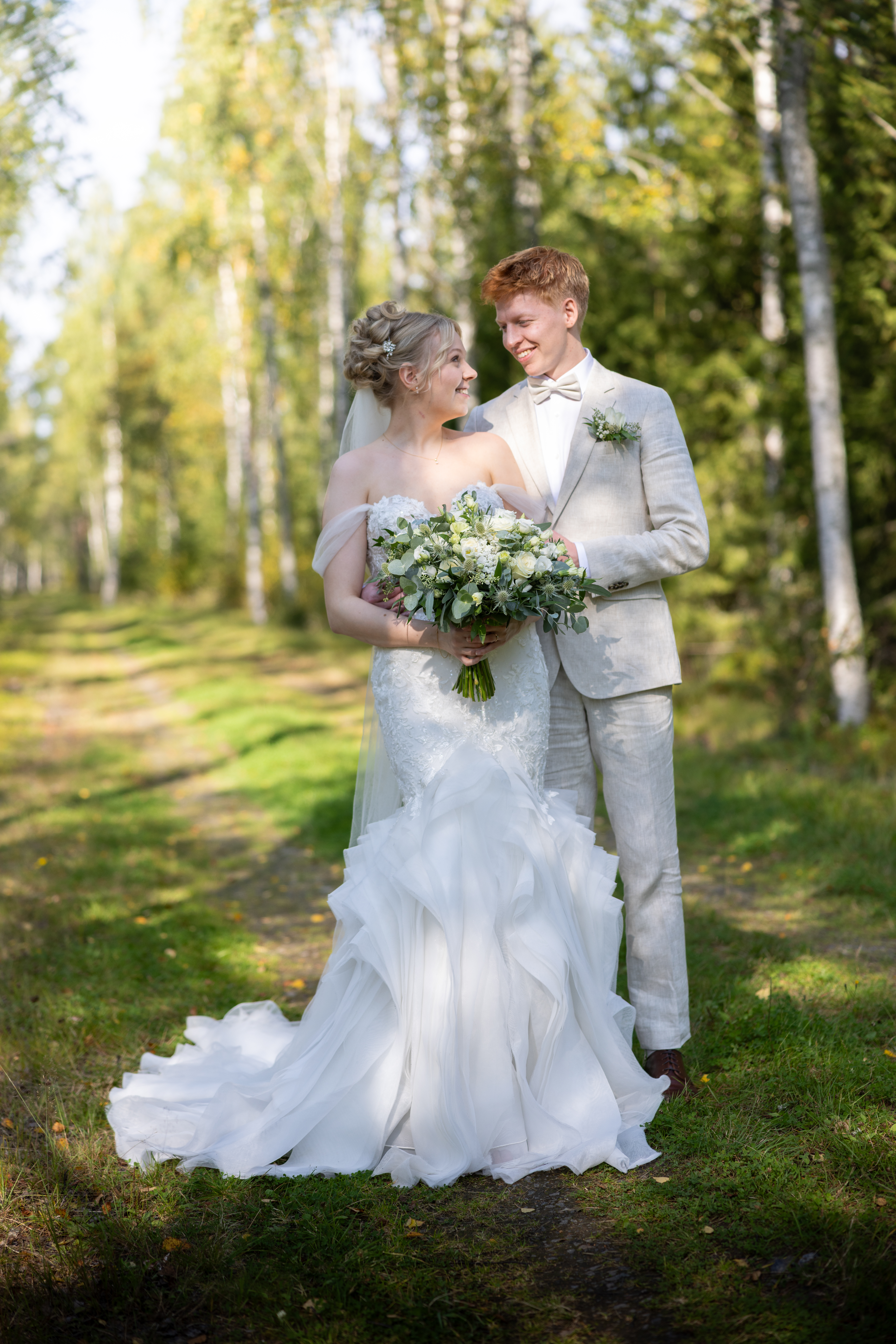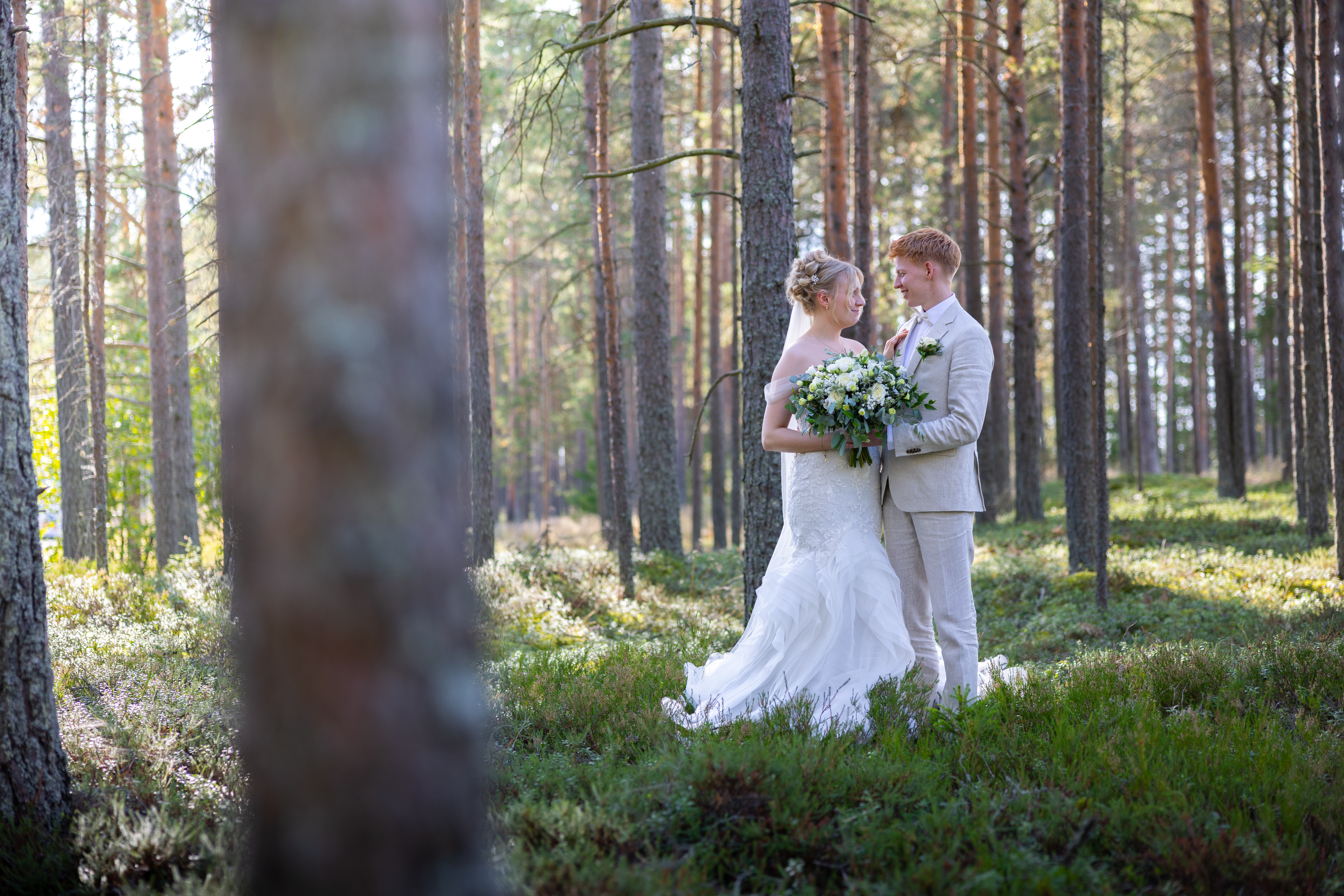 - Bride and groom in a sunlit forest