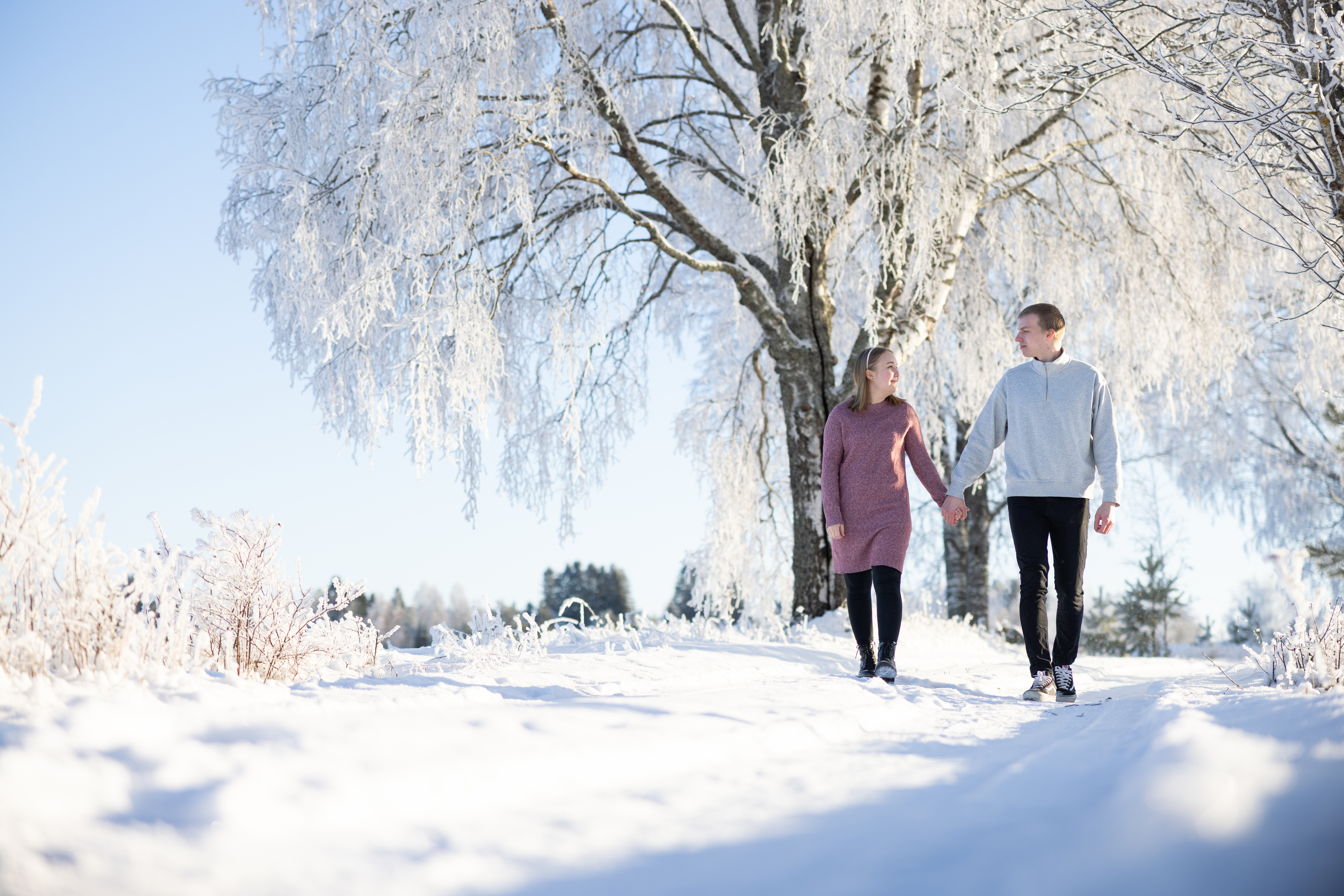 - Couple walking in snowy landscape