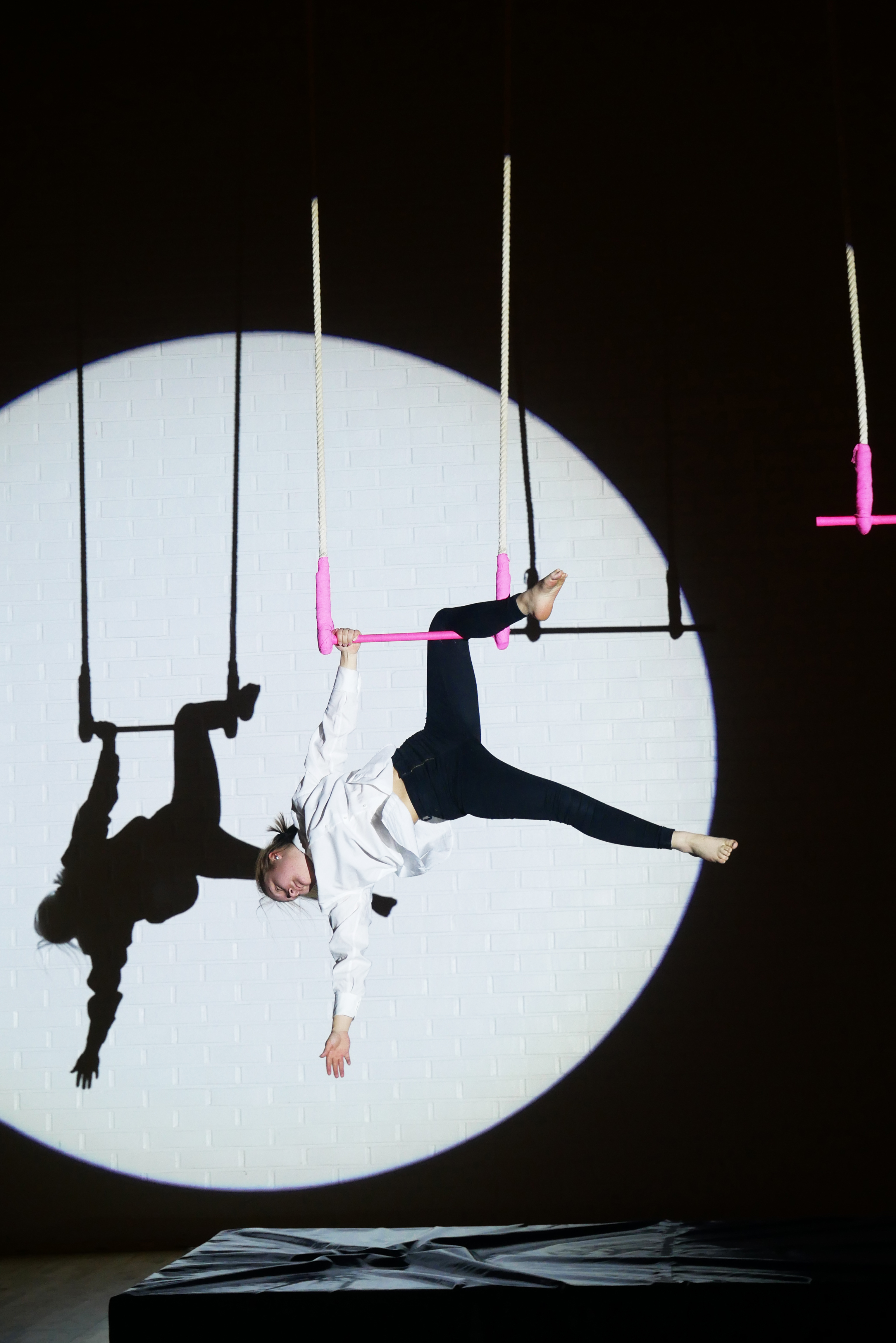 - Acrobat on aerial straps in spotlight, photography