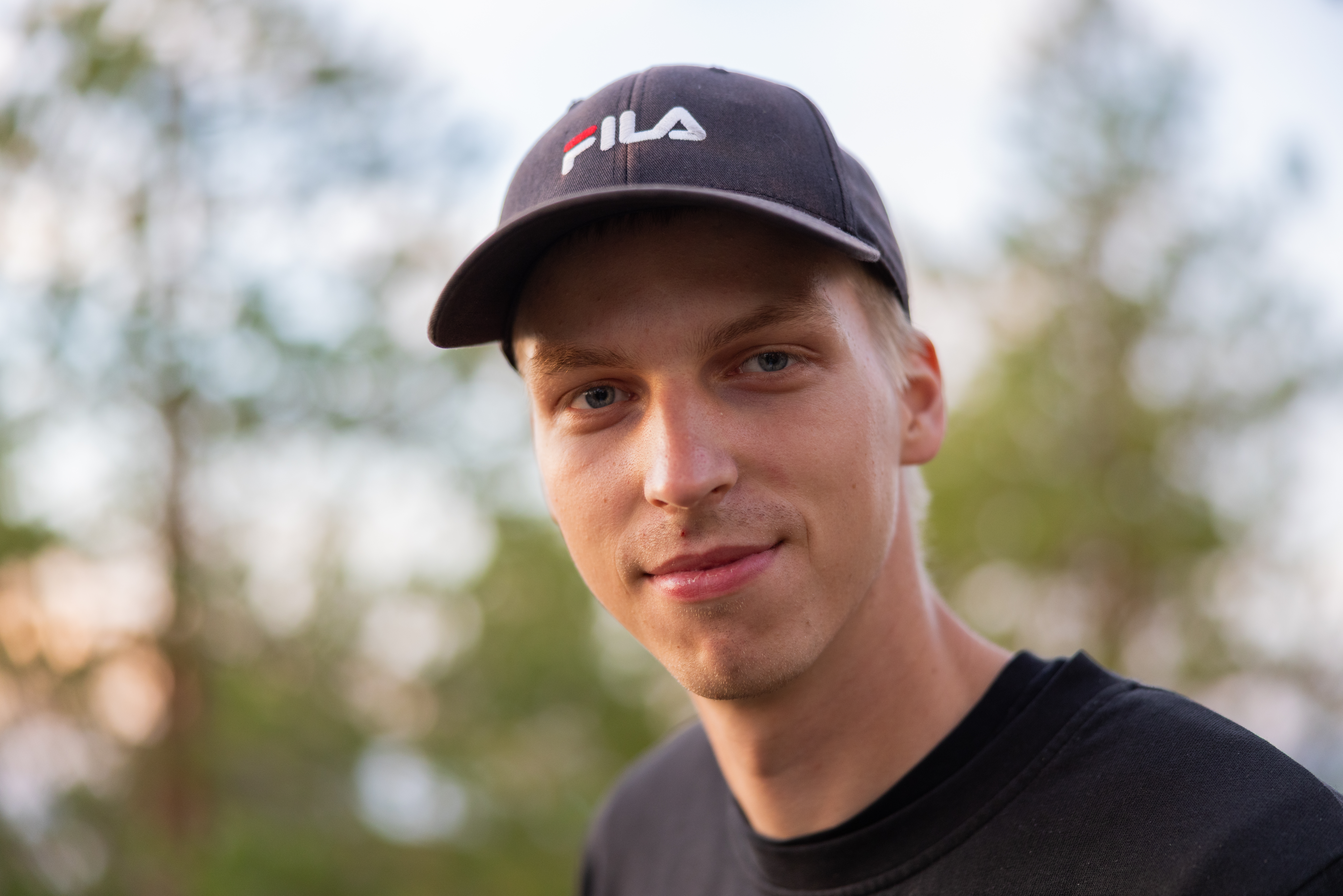 - Portrait of a young man wearing a black Fila cap