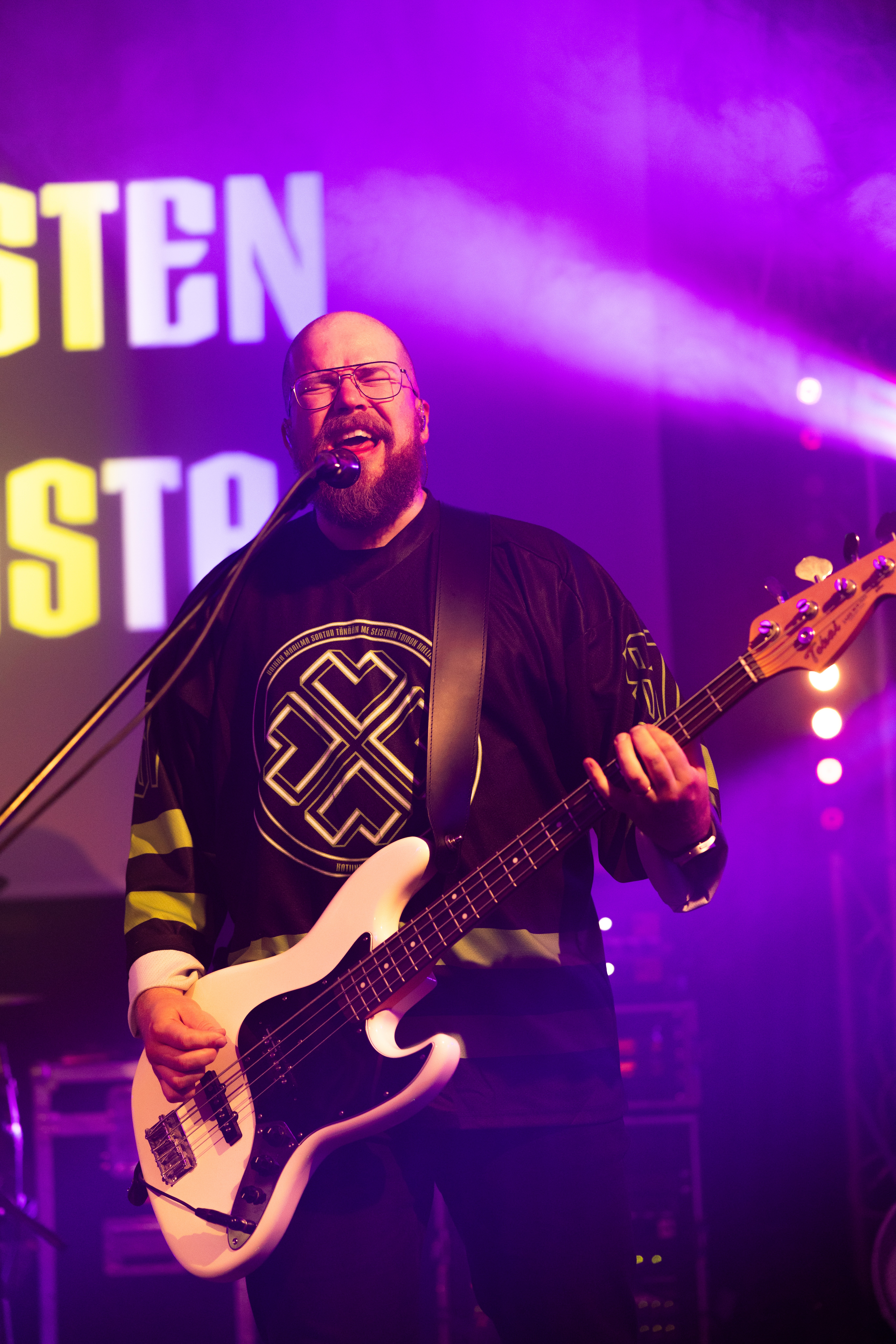 - Bearded man playing bass guitar on stage