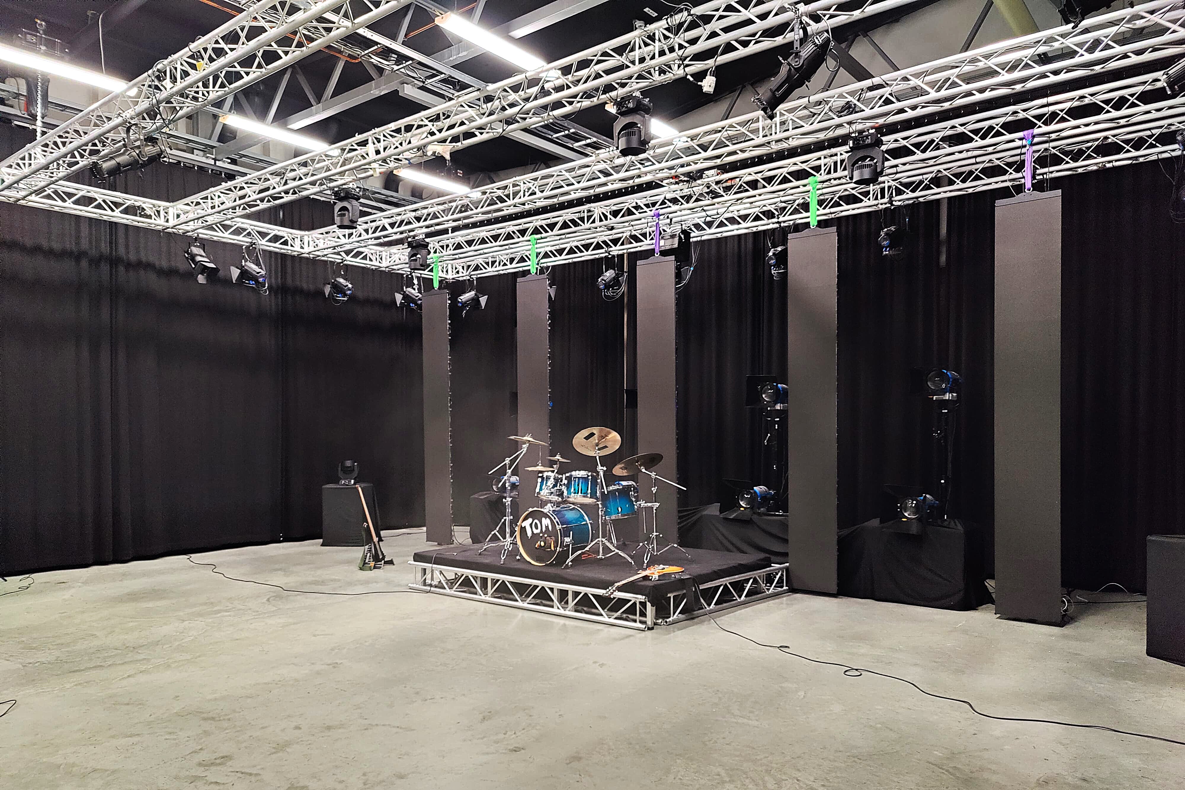 - Drum set on stage in music studio