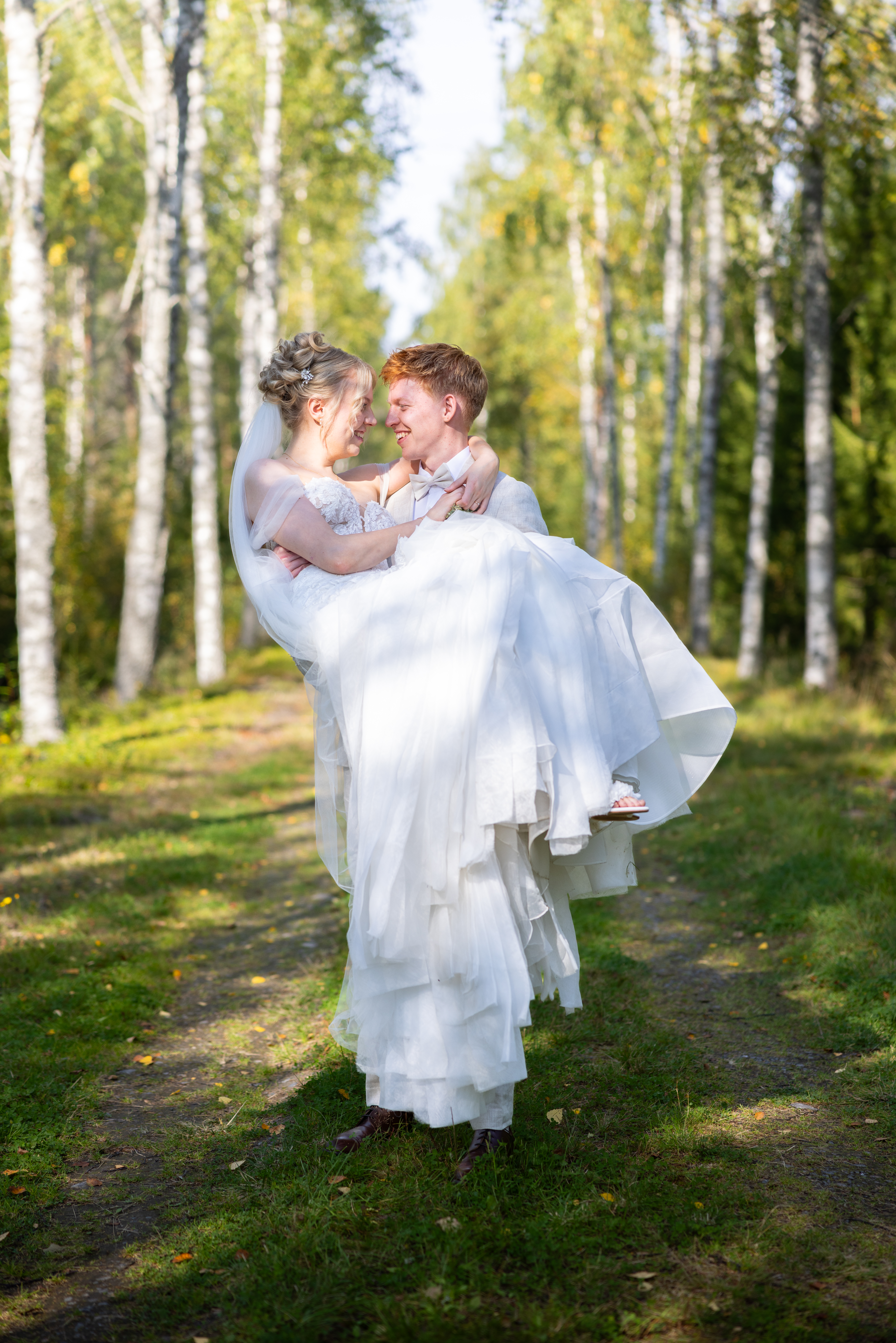 - Wedding photography of groom carrying bride in birch forest