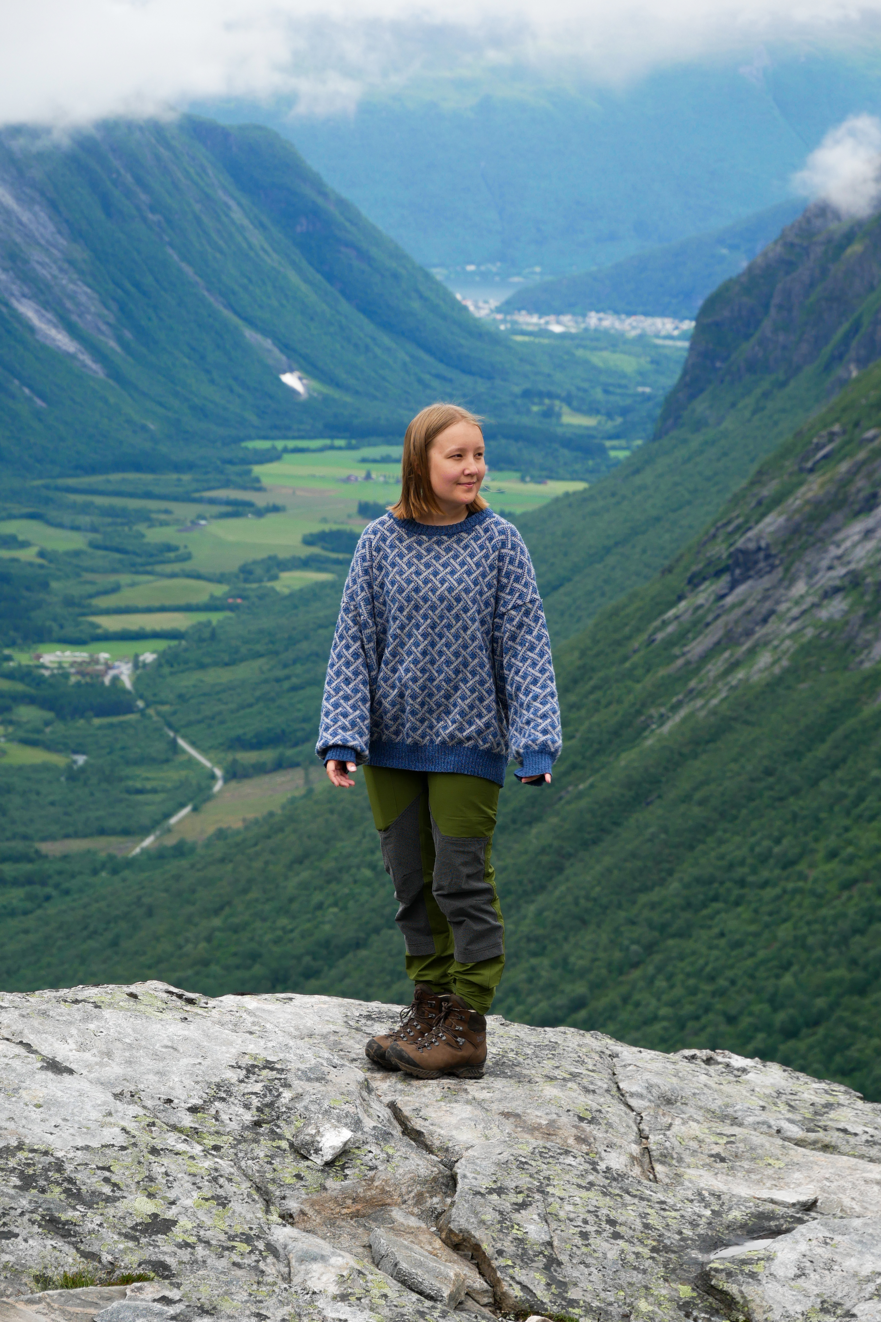 - Woman on cliff overlooking a green mountain valley