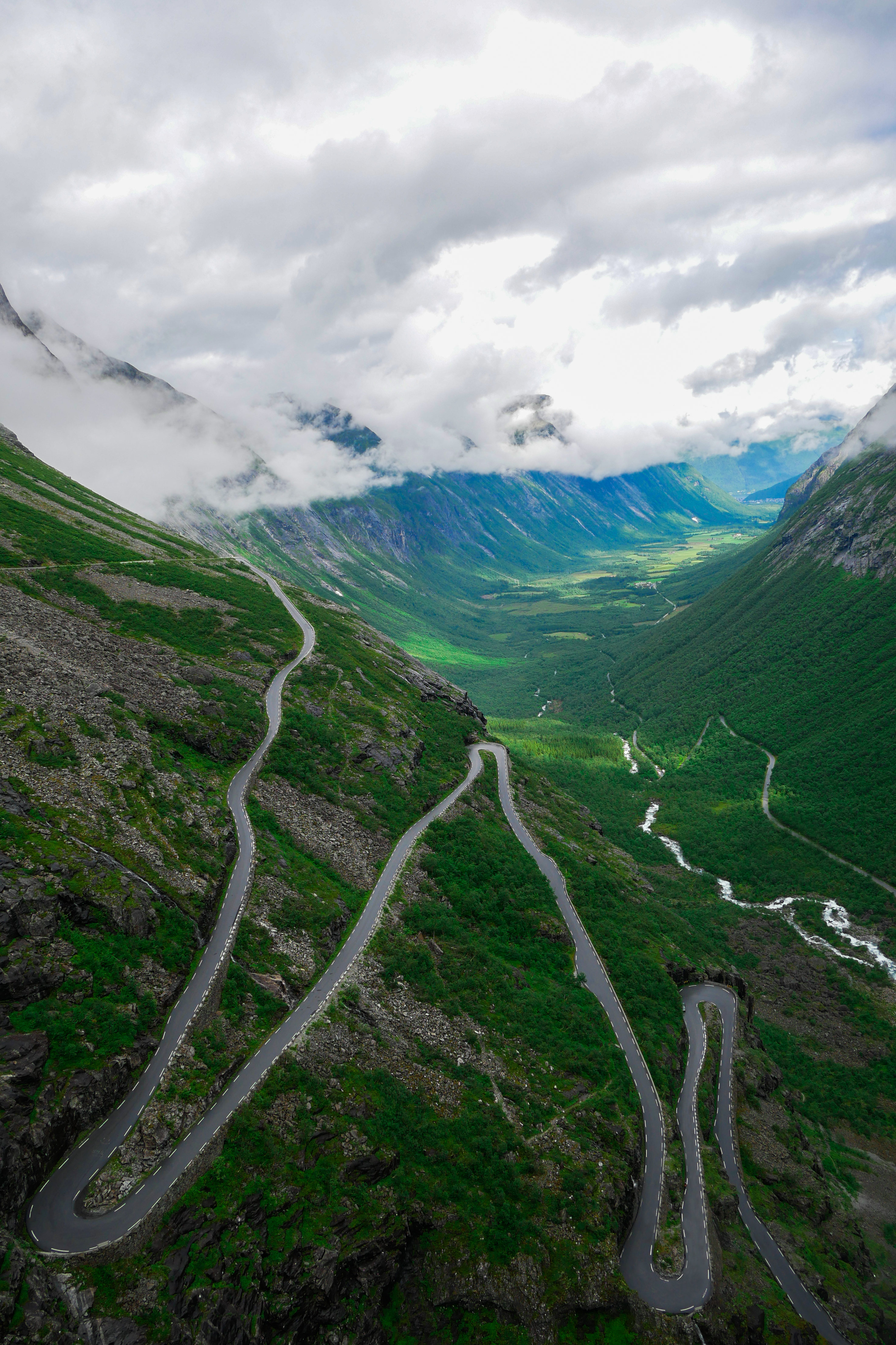 - Winding road descending into a green mountain valley under cloudy sky