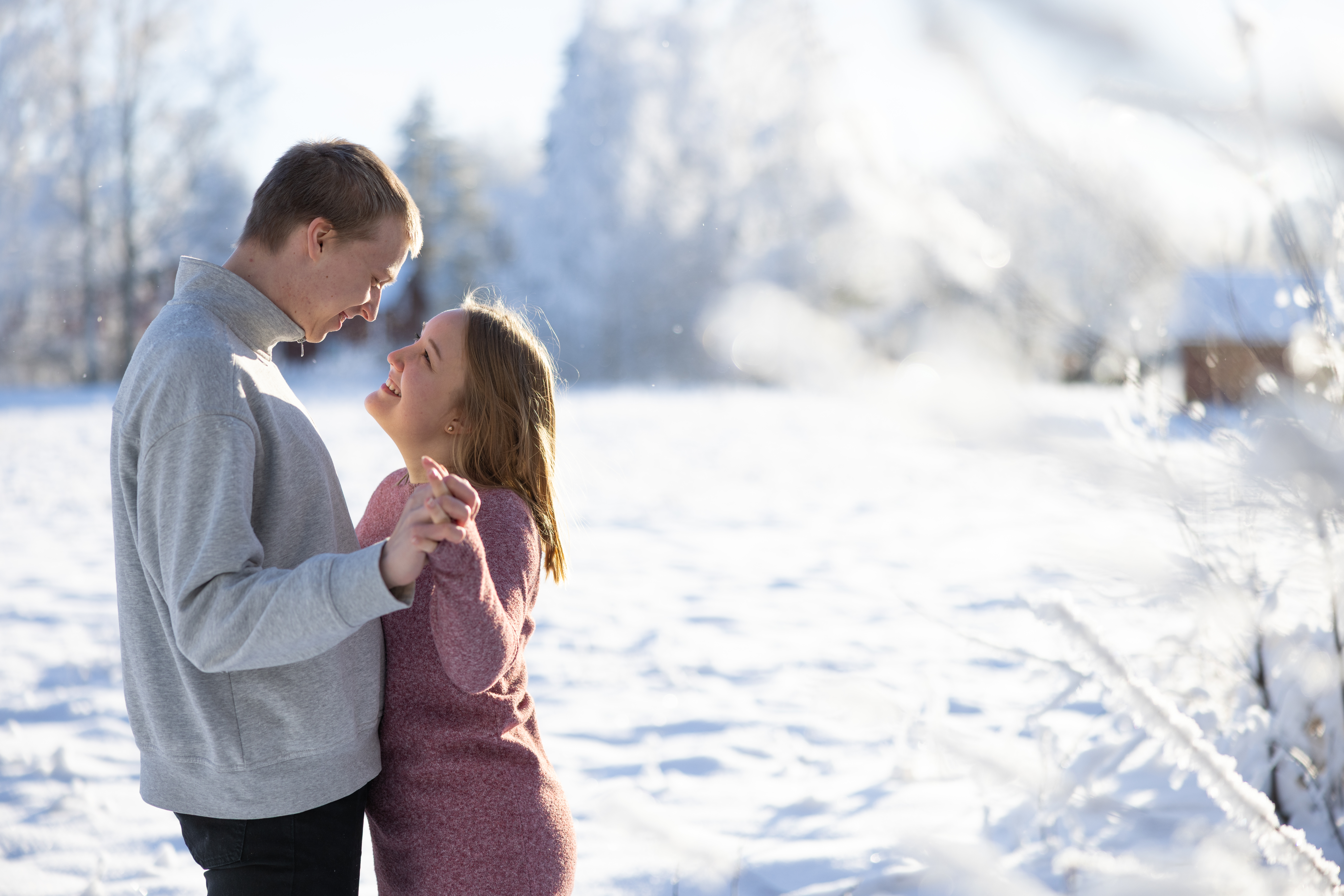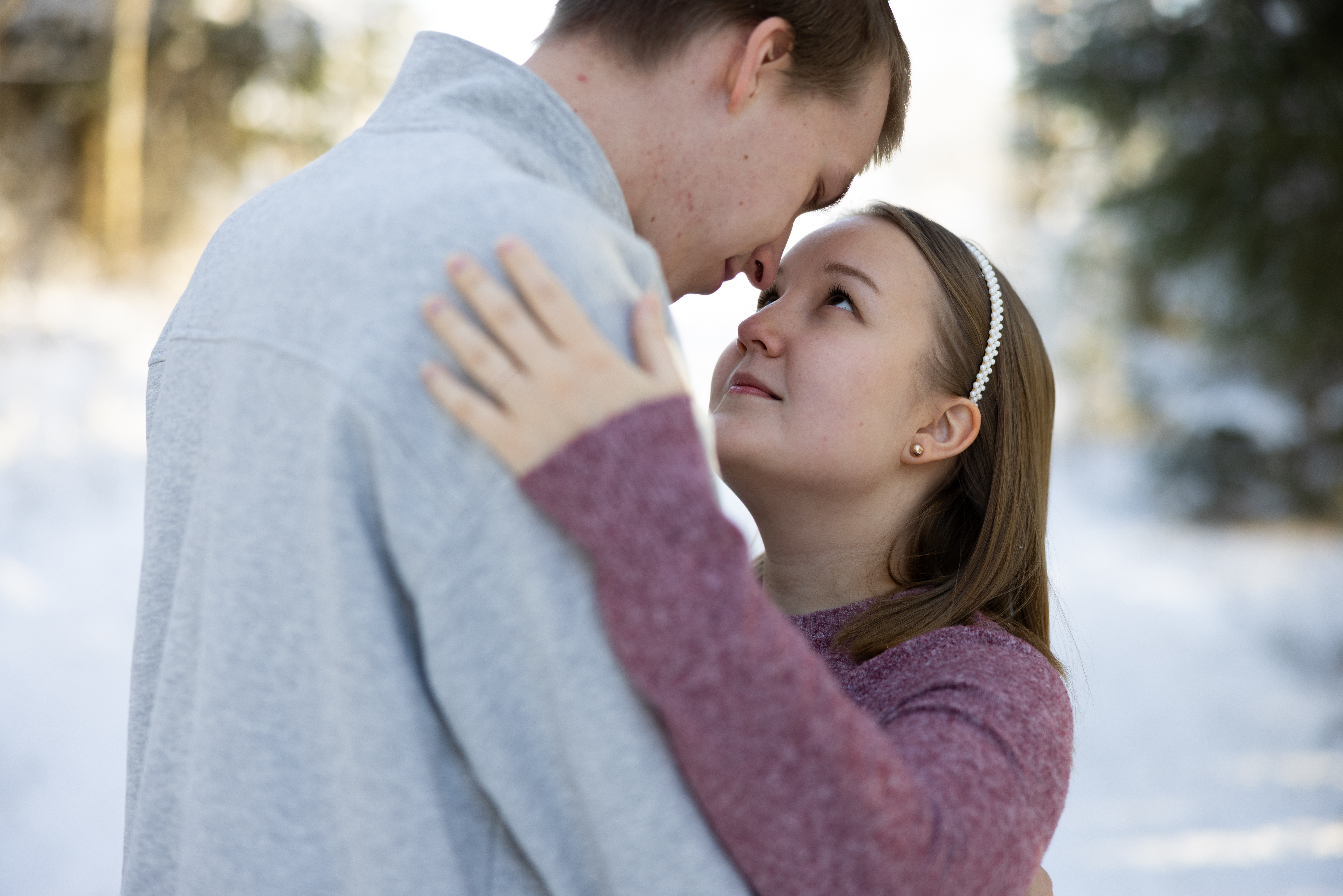 - Couple embracing outdoors in winter, portrait photography