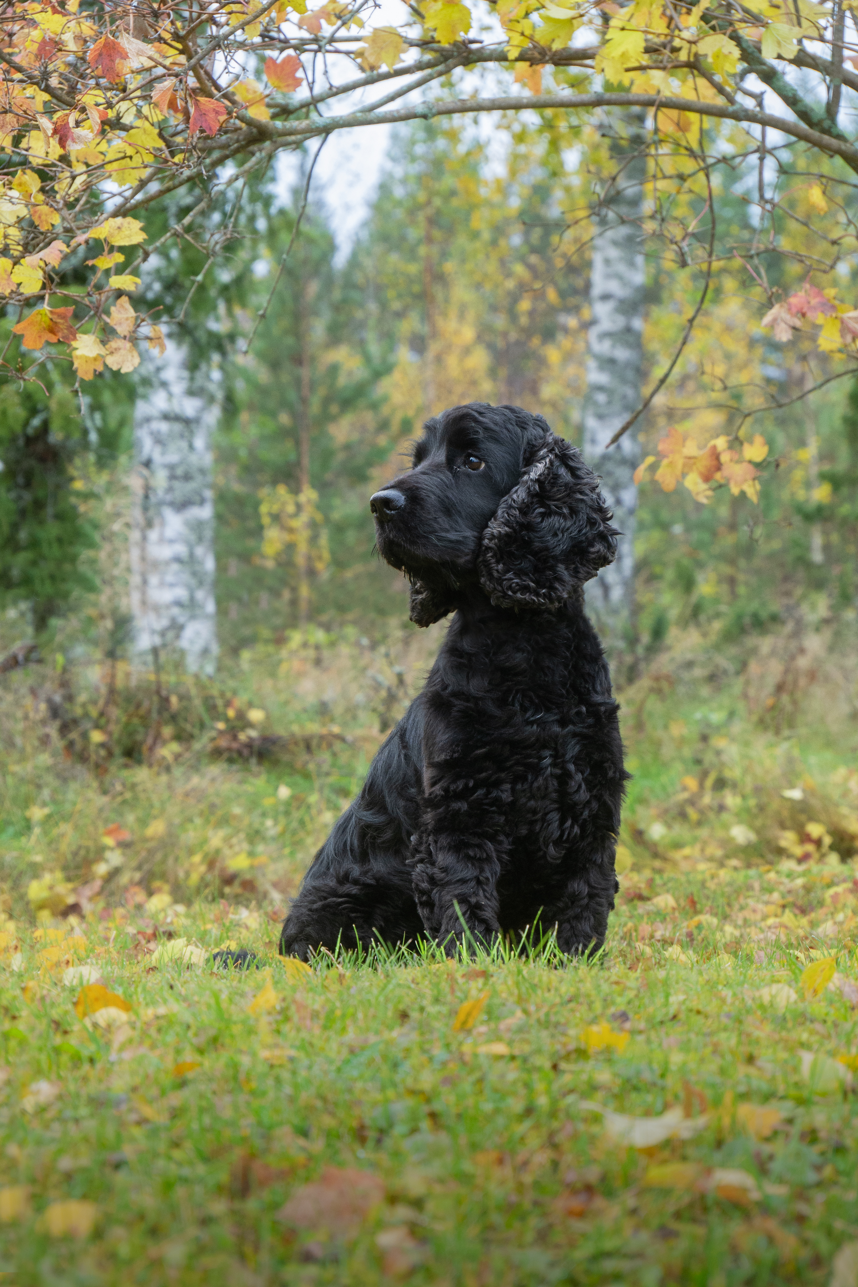 - Black dog sitting in autumn leaves