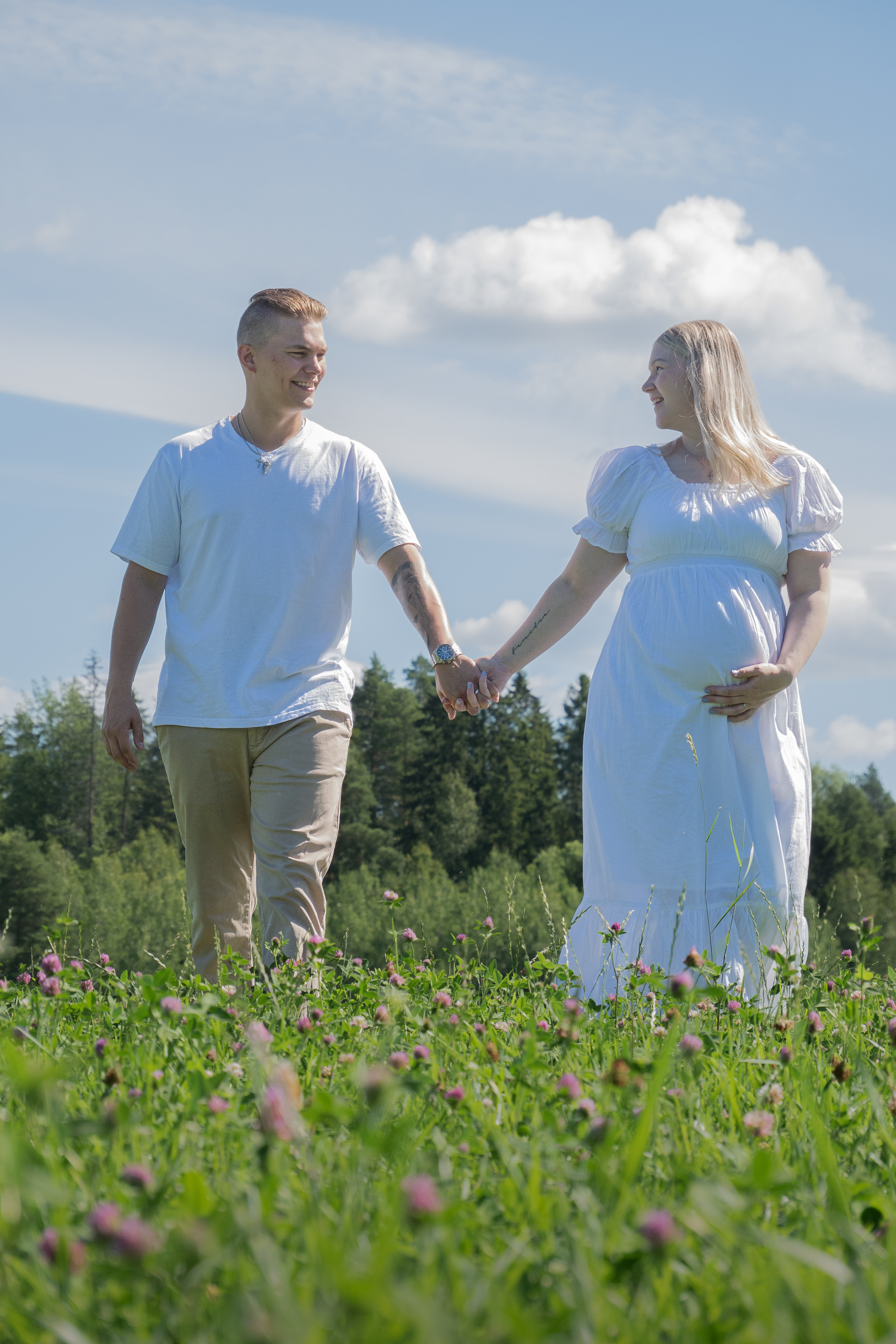 - Smiling pregnant couple walking hand in hand in a sunny field