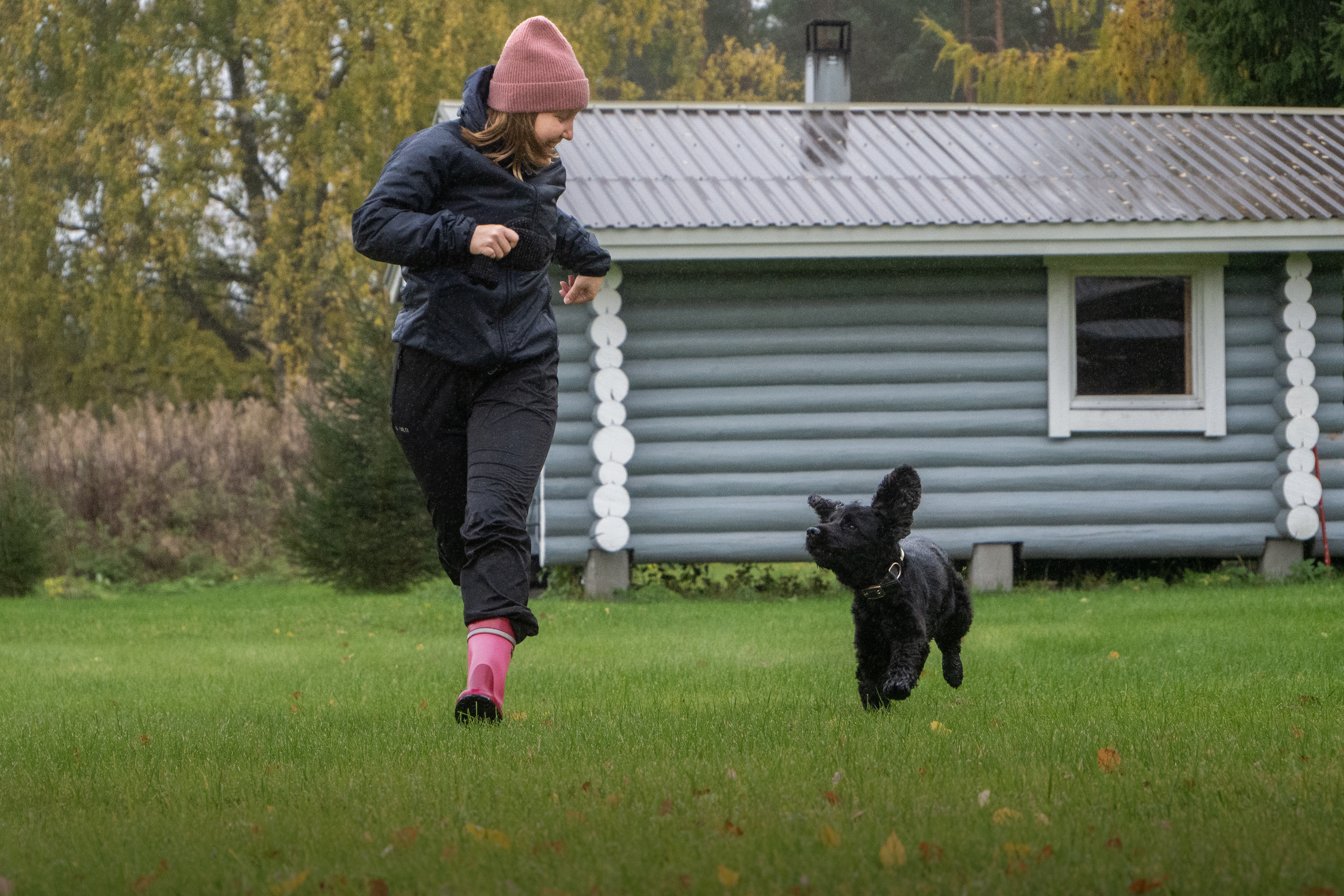 - Woman in pink beanie playing with black dog