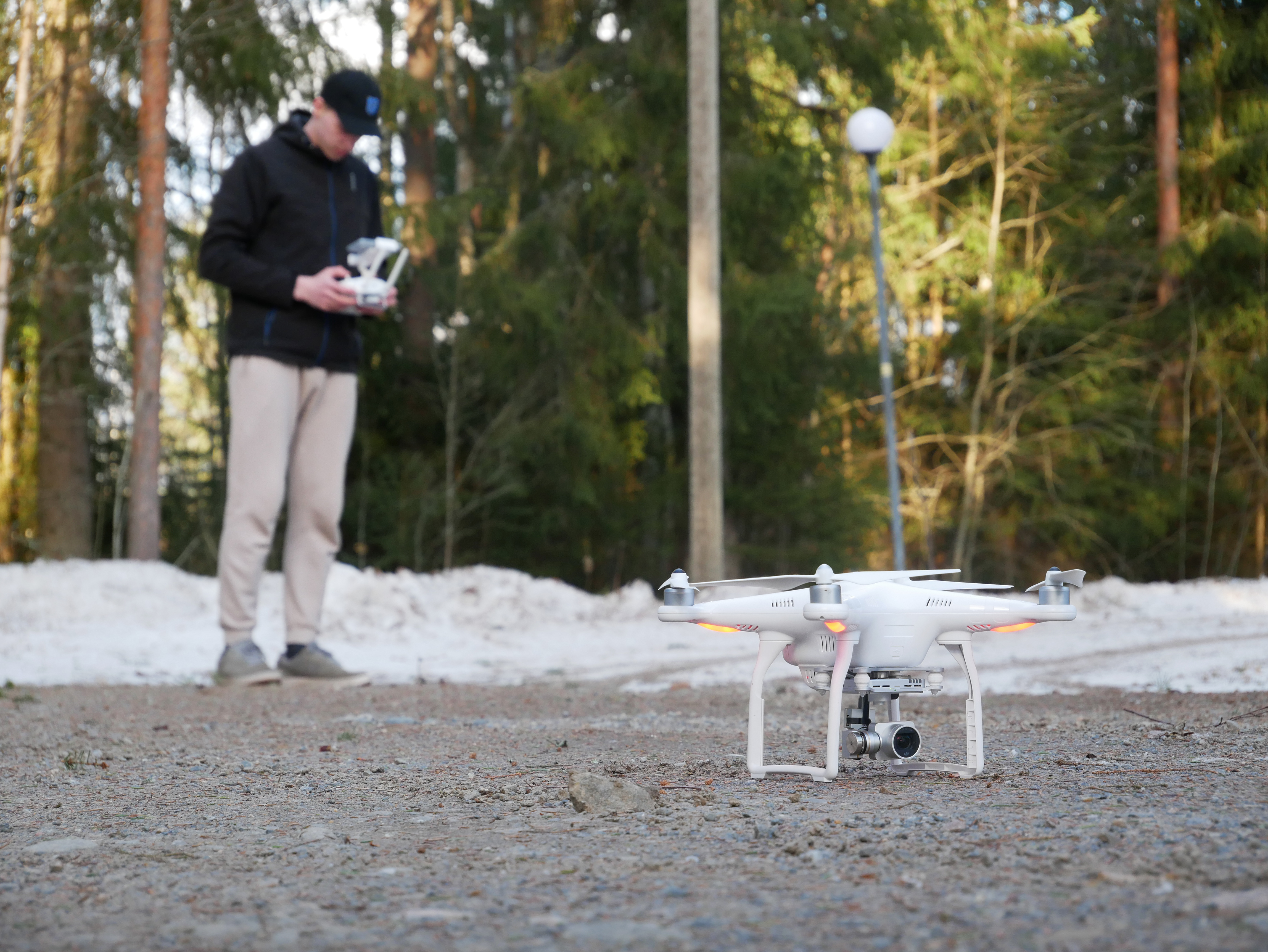 - Man with remote control next to drone for photography