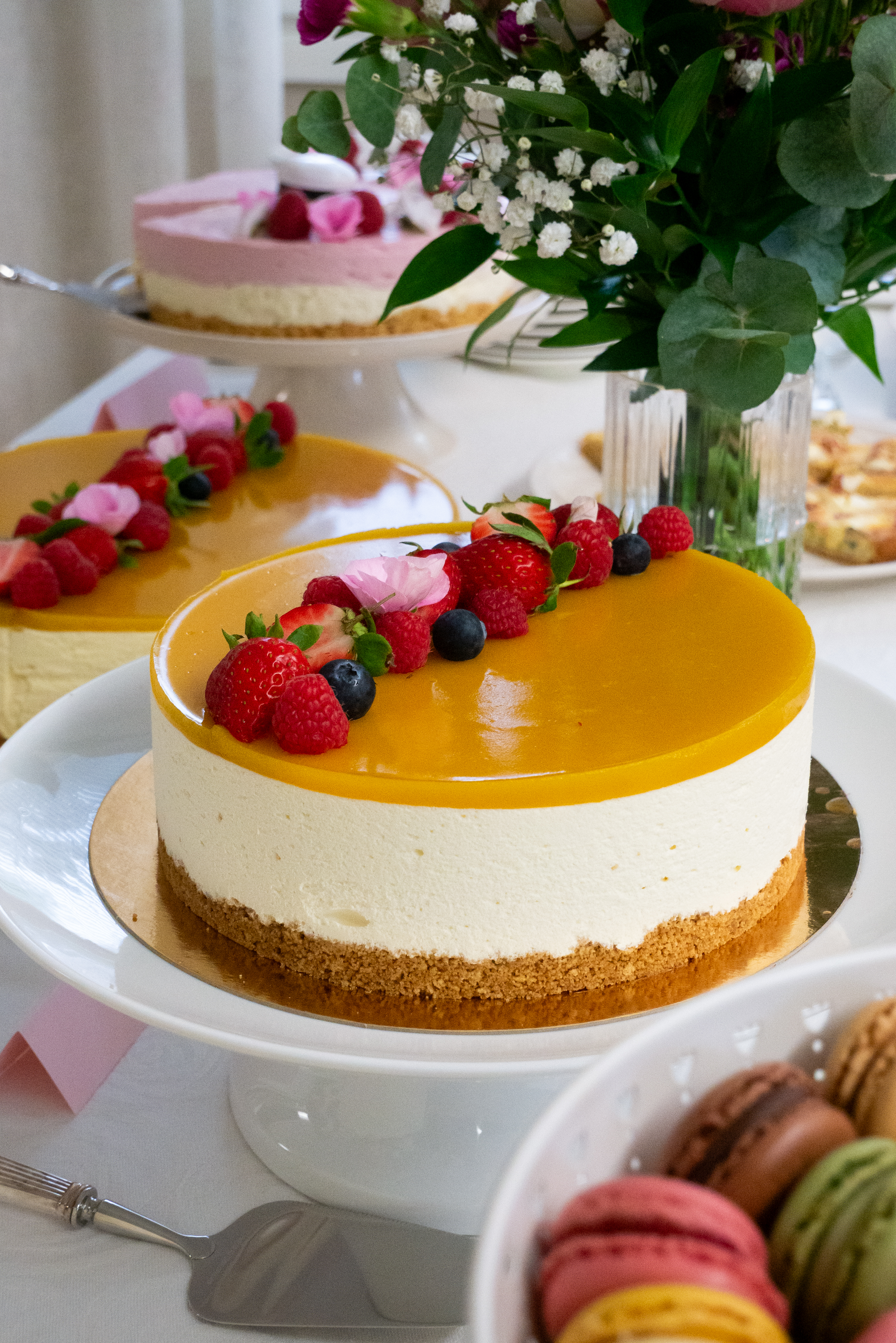 - Cheesecake with golden glaze and fresh berries