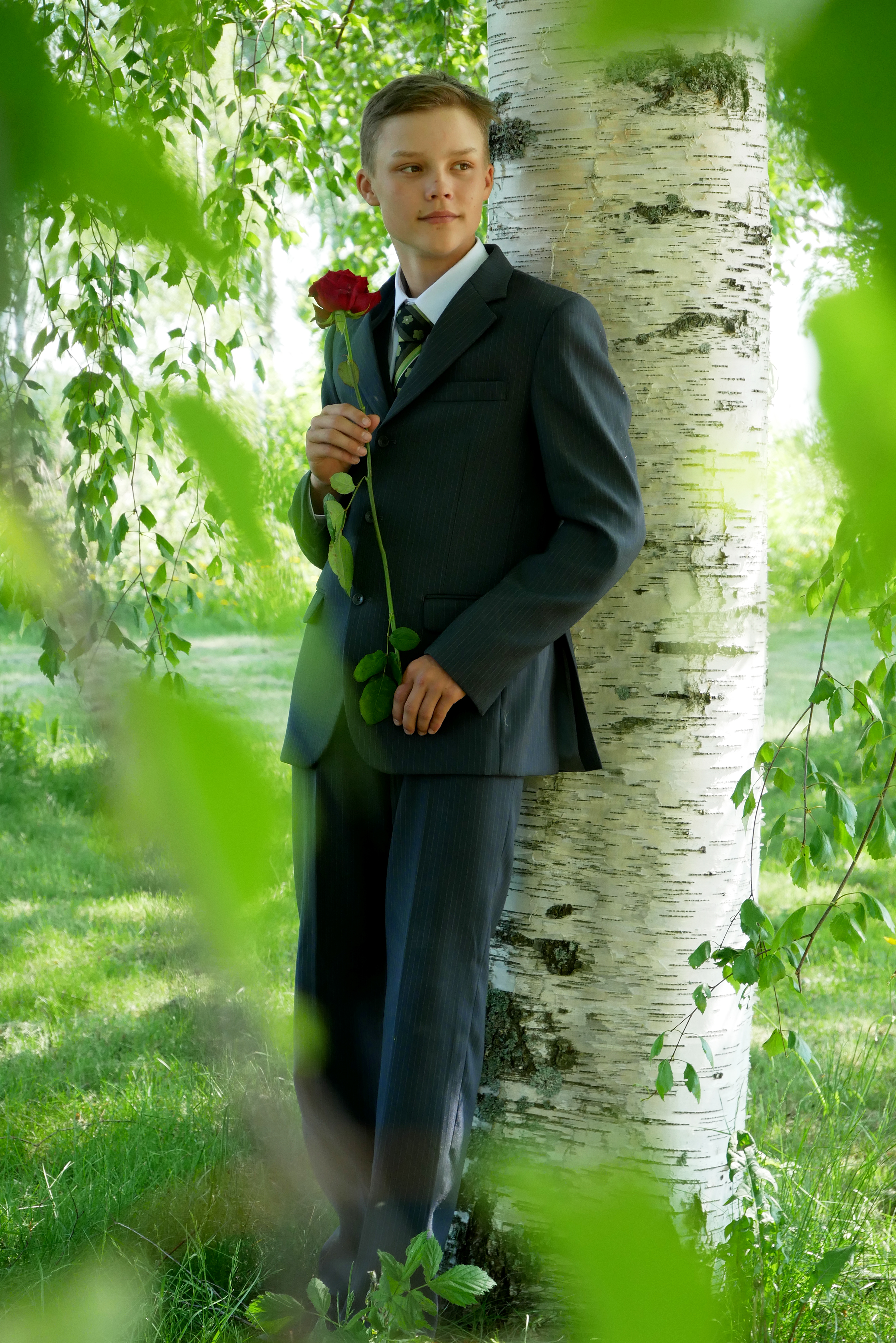 - Man in suit with red rose leaning on a birch tree for photography