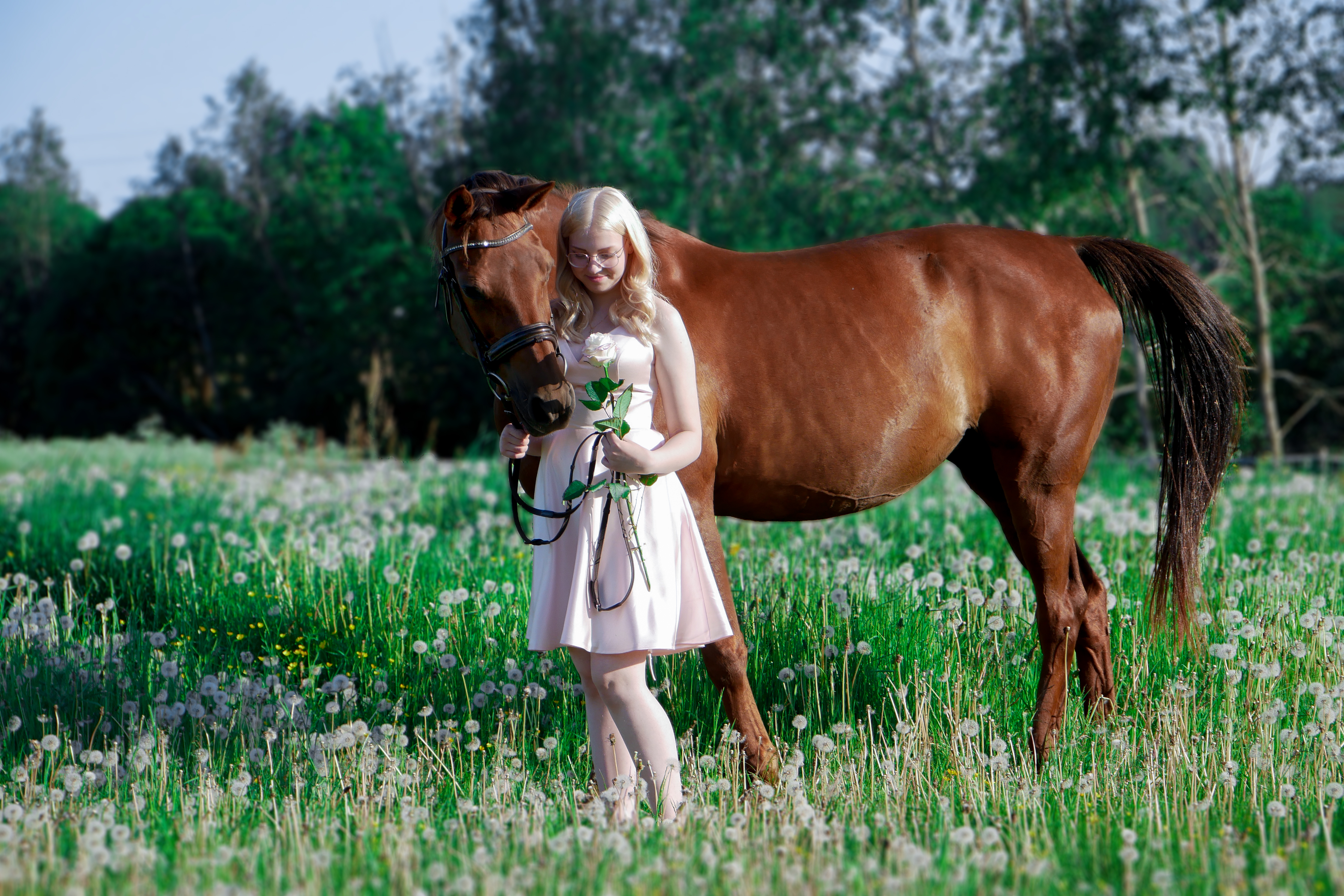 - Blonde woman with horse in a field of flowers