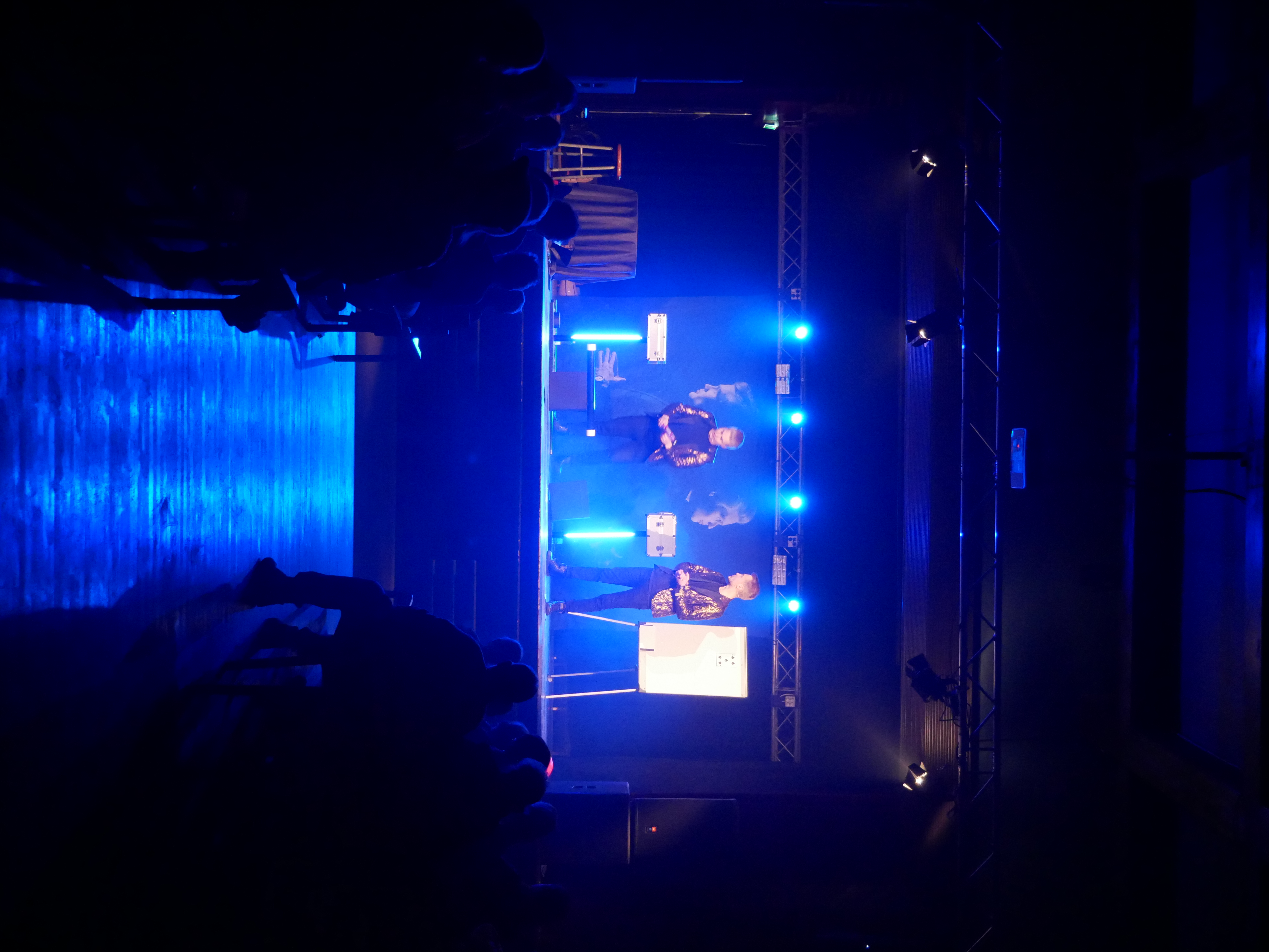 - Two people on stage under blue lights with an audience