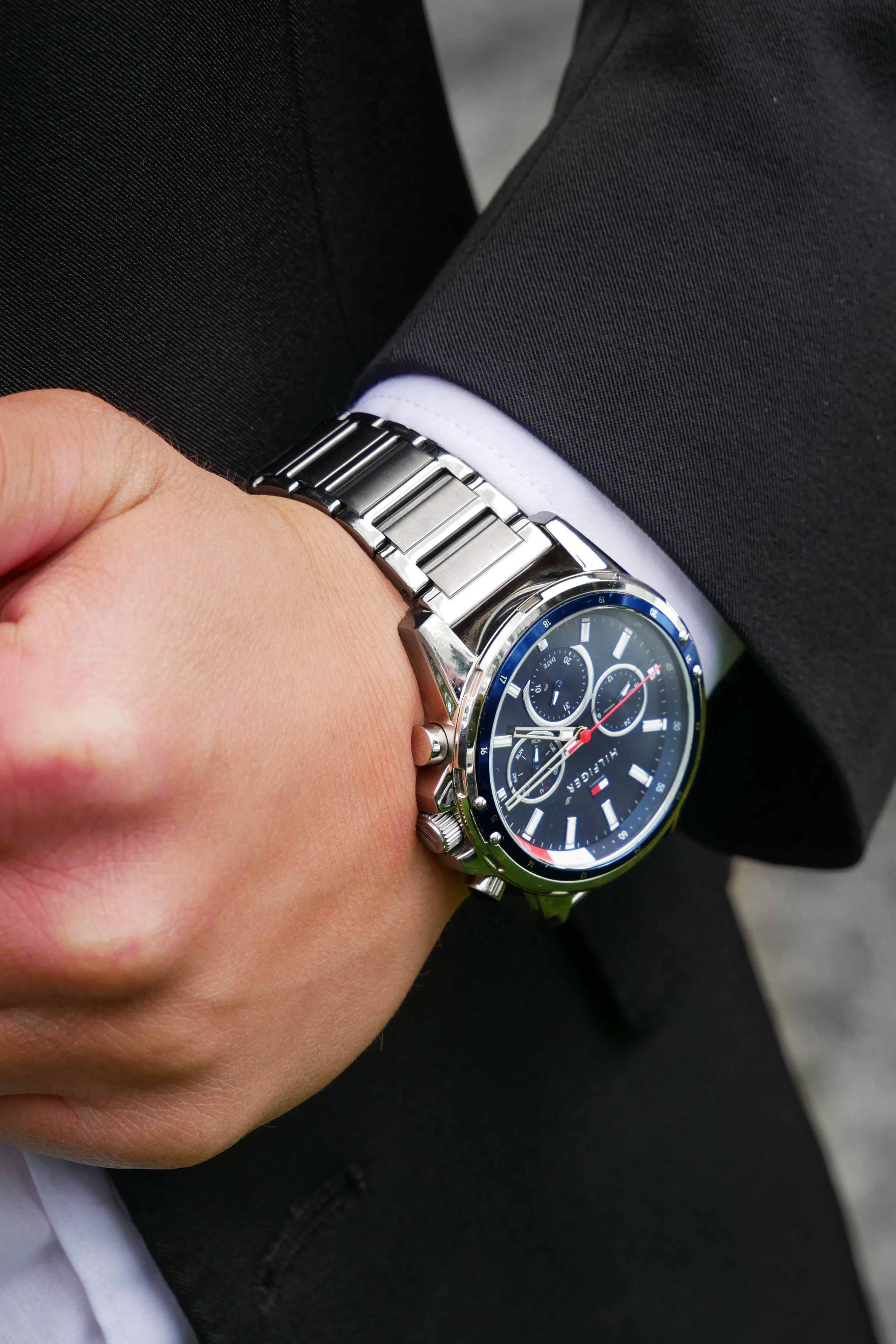 - Man's wrist wearing a silver wristwatch