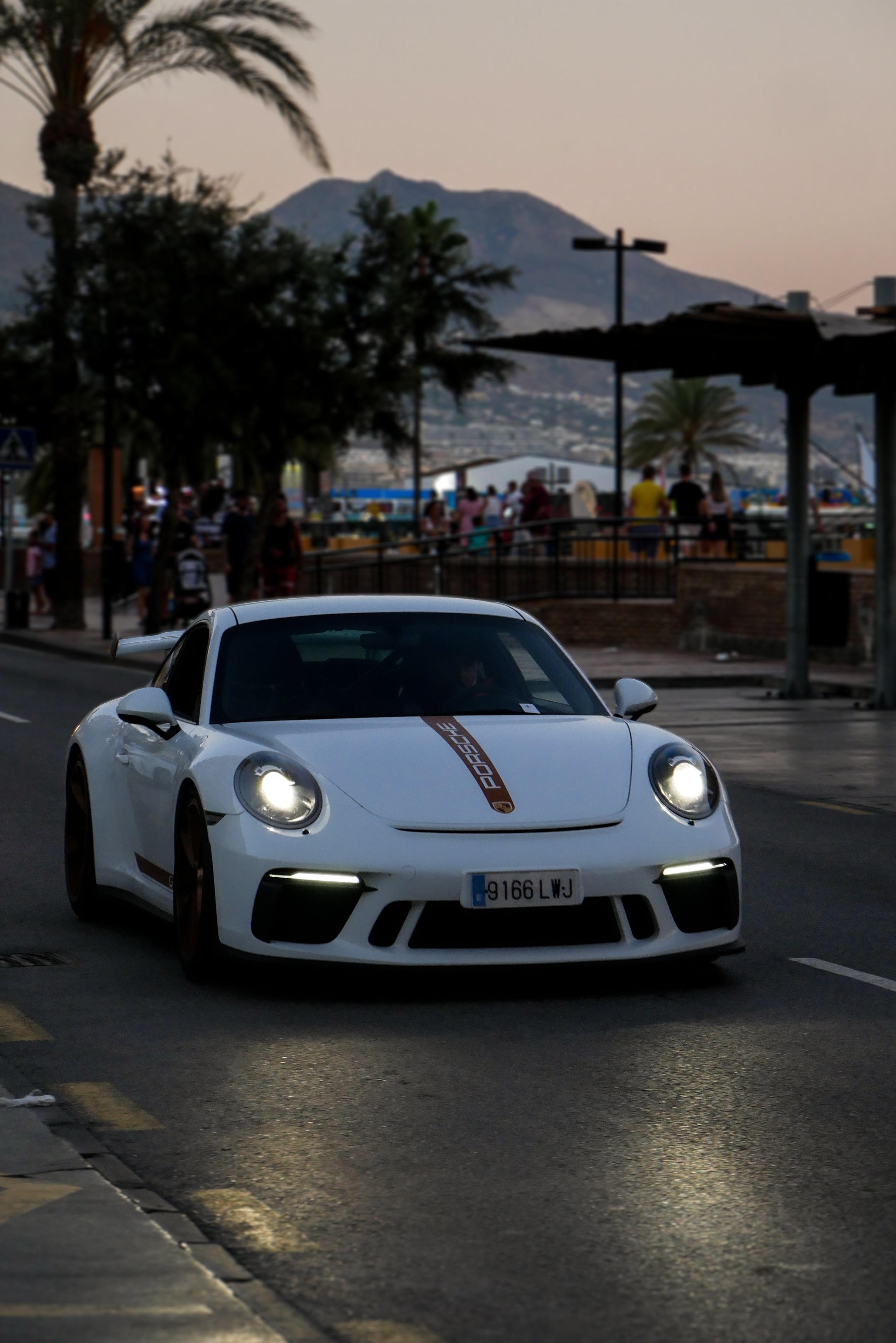- White Porsche sports car driving at night